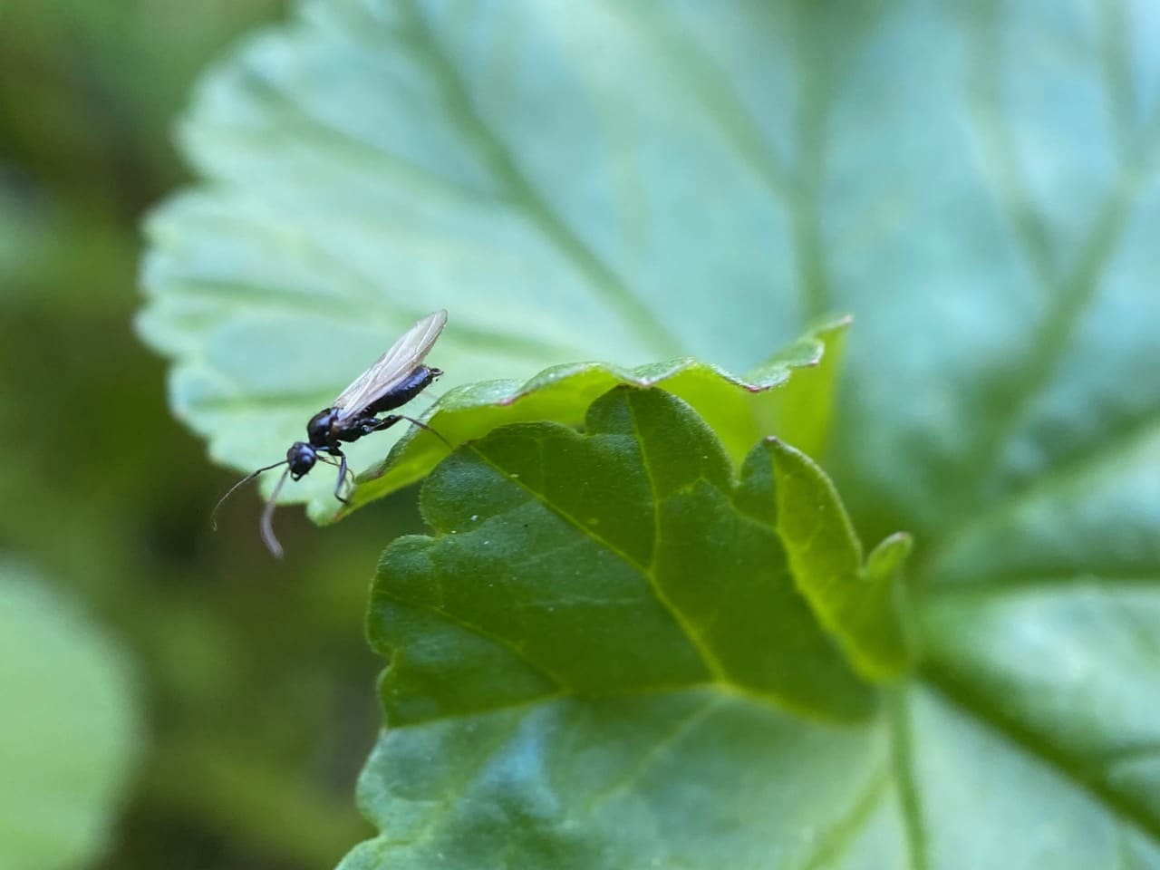 A little while later I spot another queen clinging upside down on a geranium leaf.