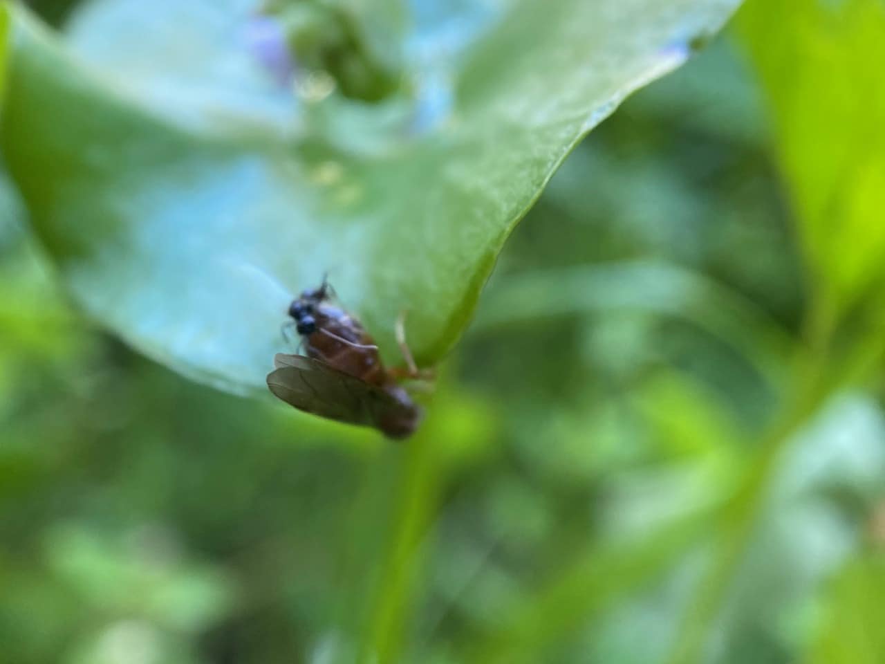 I have the camera focused on the queen, but the action is so fast I only get a blurry picture of the mating event. As soon as the male alate makes contact with the queen, the pair tumbles off the leaf into the undergrowth below.