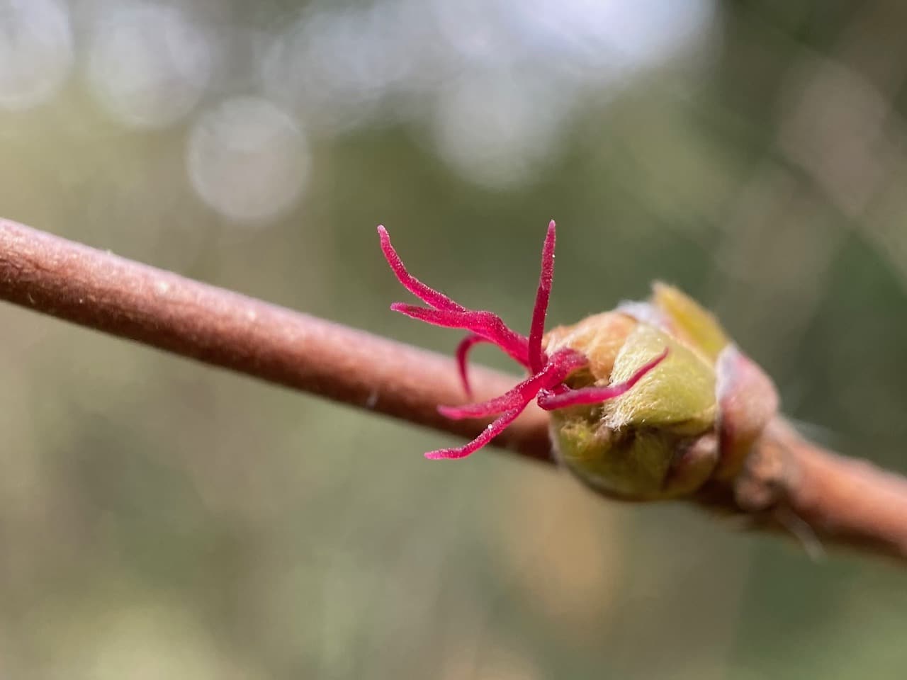It takes a bit of searching, but I am happy to finally find a couple of female flowers on the Beaked Hazelnut.