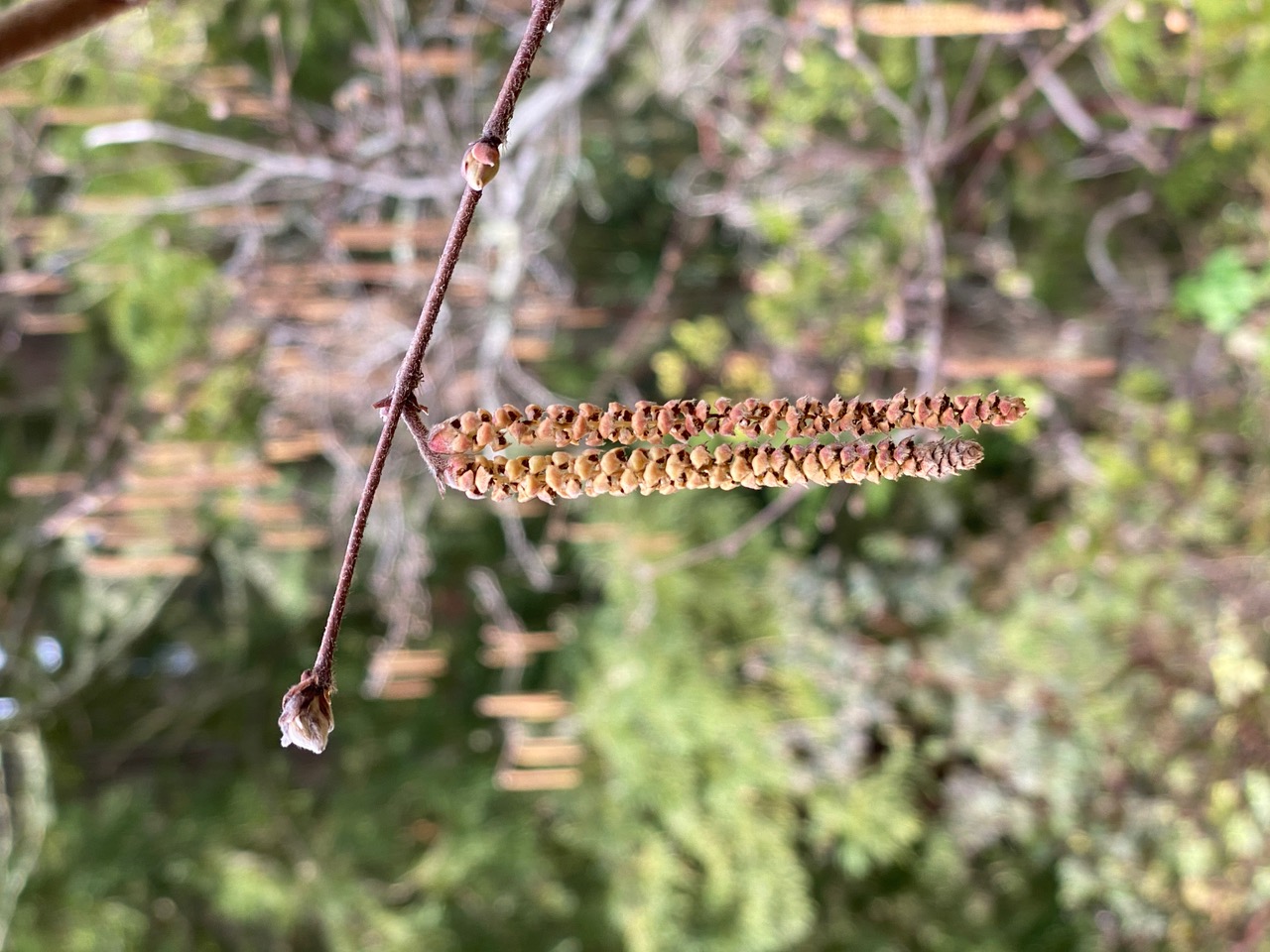 The male catkins on the large Beaked Hazelnut, Corylus cornuta are mostly spent now, hanging in loose, dry chains from the bare branches. Ah, it’s time to look for the female flowers!