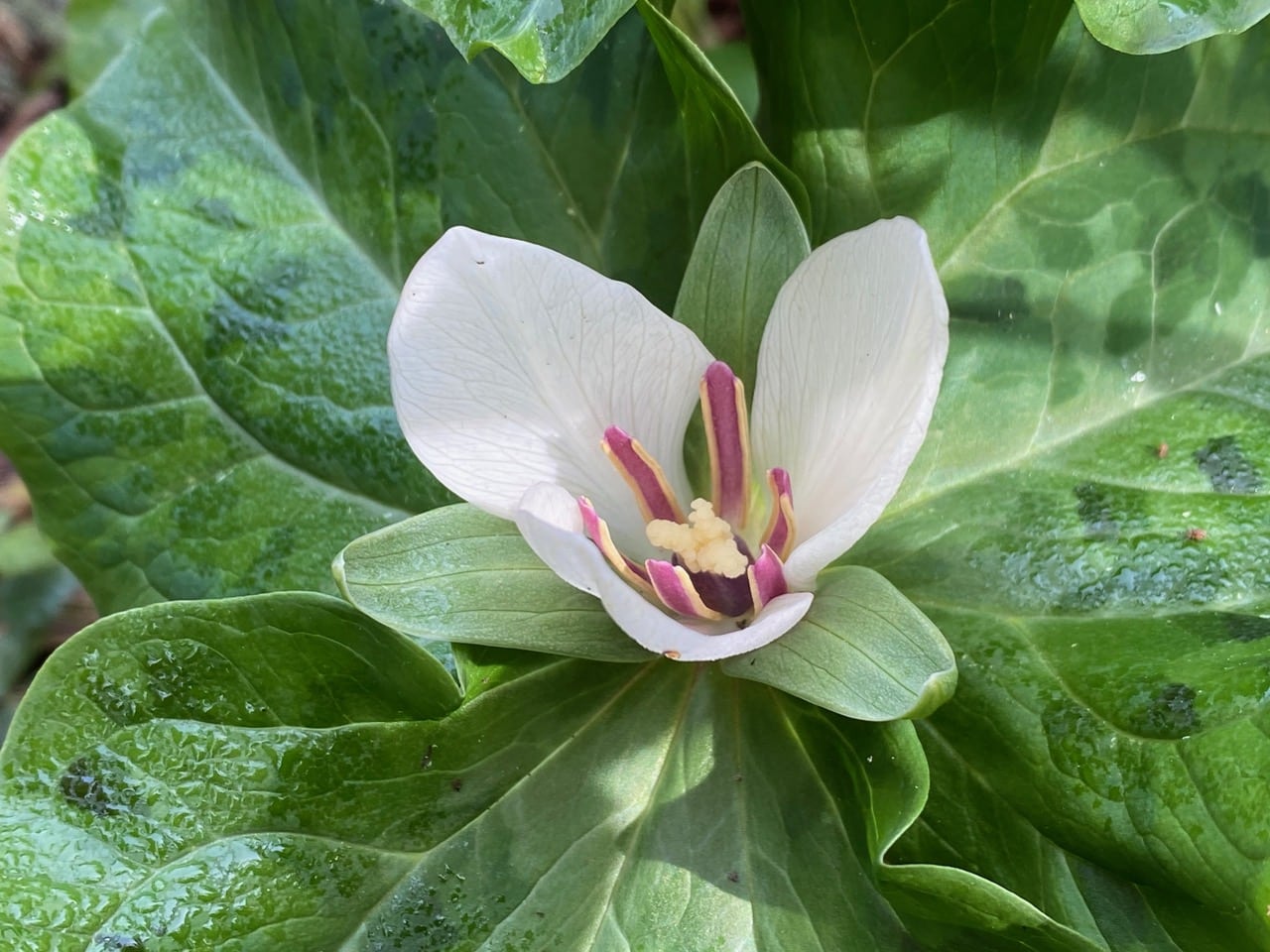 Nearby, we have a different species of Trillium, Trillium ovatum or the Western or Pacific Trillium. Its typically white petals have withered, showing the long pedicel or flower stalk that holds the flower above the leaves. Given its swelling ovary, the flower has obviously been successfully pollinated. By whom? I have yet to see an insect visit these Trillium flowers.
