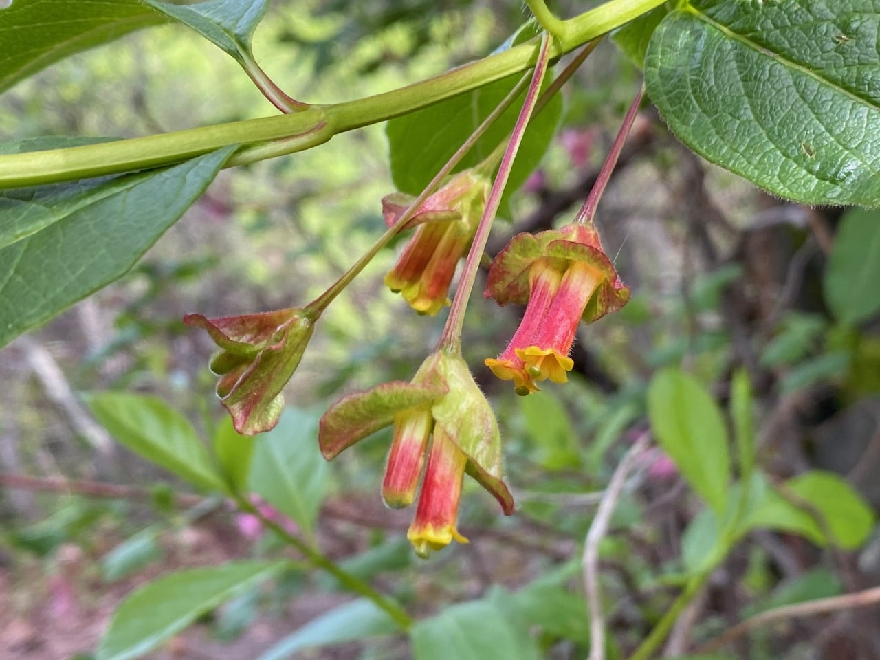 I am surprised to learn that the Twinberry flowers are monoecious, meaning separate male and female flowers are borne on the same plant. All the flowers pictured here appear to be female, with prominent style and stigma protruding slightly beyond the corolla. I have to look for the male flowers on my next visit to the garden.