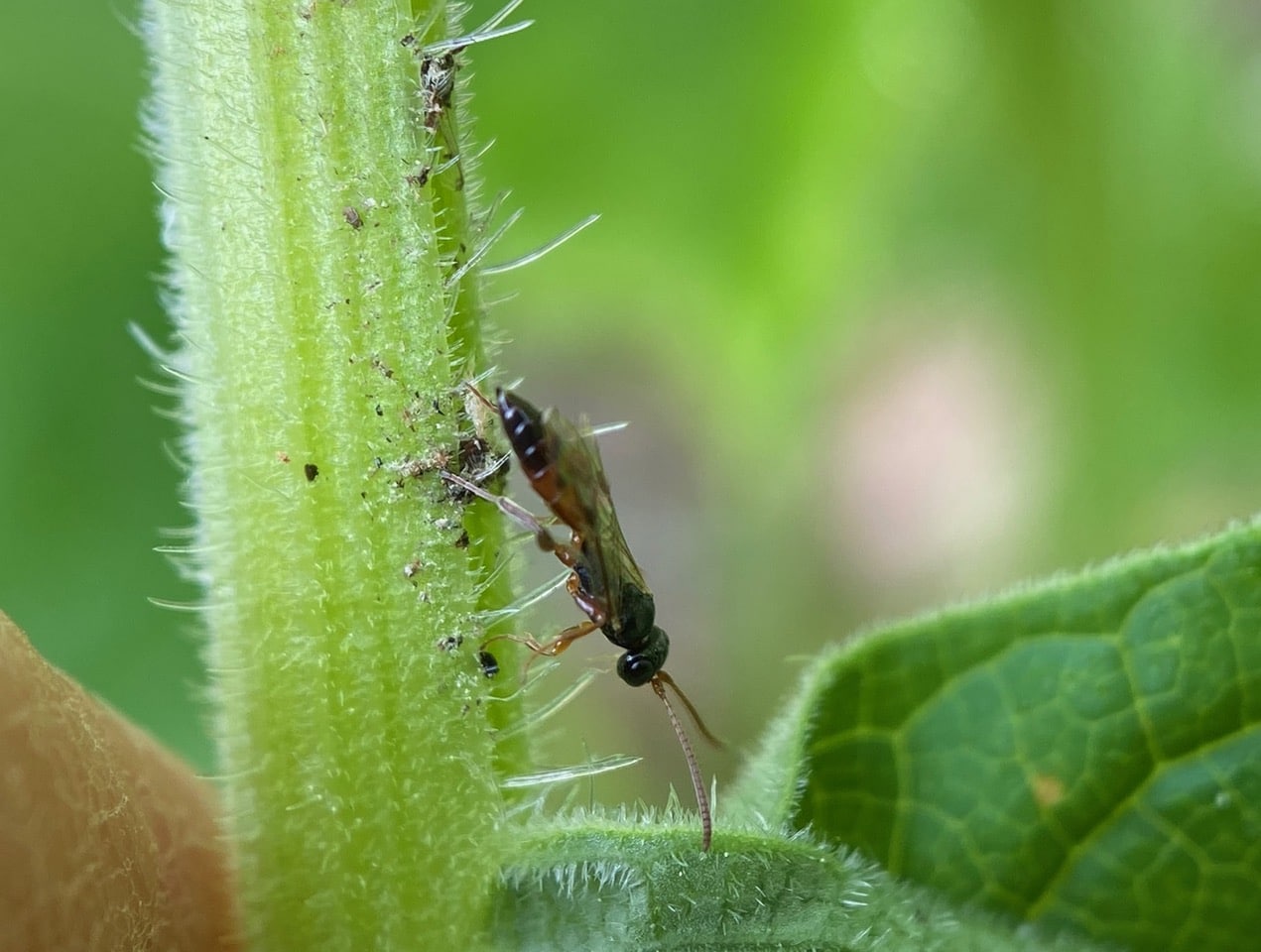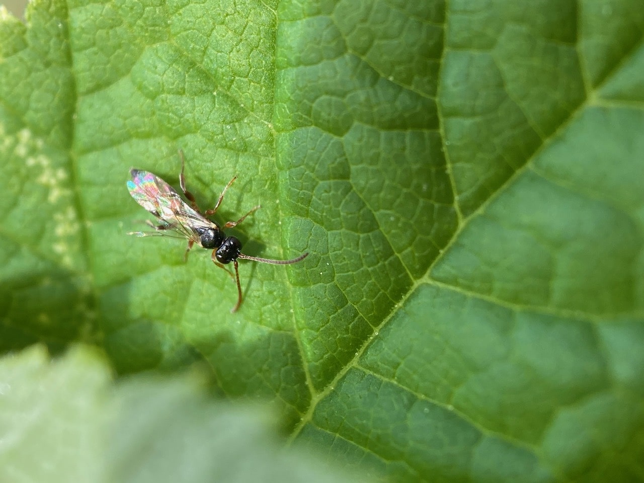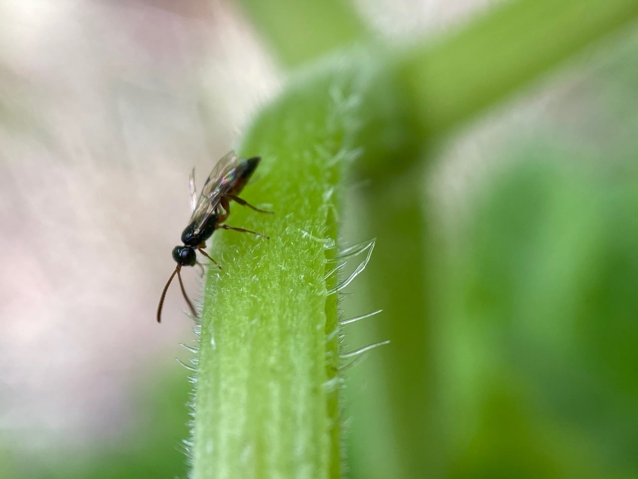 A small black wasp is exploring the leaf of a Cow Parsnip. iNaturalist has helped identify it as a member of the tribe Phaeogenini (family Ichneumonidae).