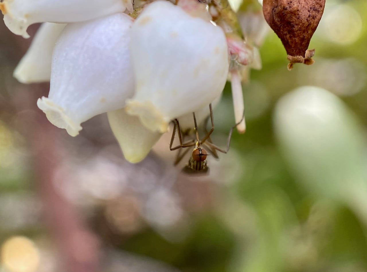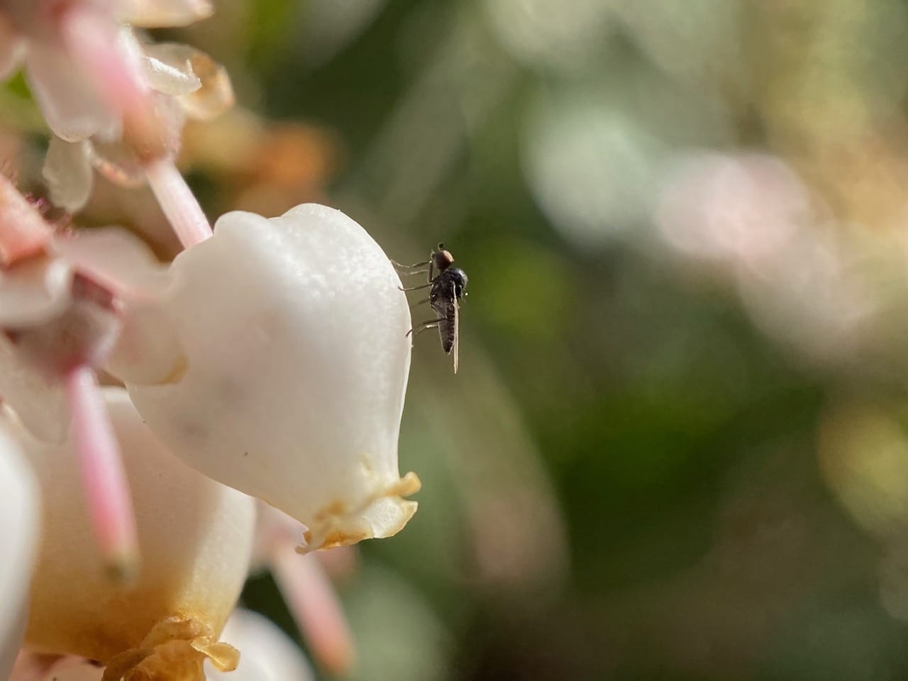 Ooh, here’s another, much smaller Dance Fly. From its humped thorax, globular head made up mostly of eyes, and short forward pointing proboscis, I recognize it as a Hybotid Dance Fly, Anthalia sp. (family Hybotidae). The fly is small enough to enter the manzanita flower. Does it feed on manzanita pollen and help pollinate the flowers?