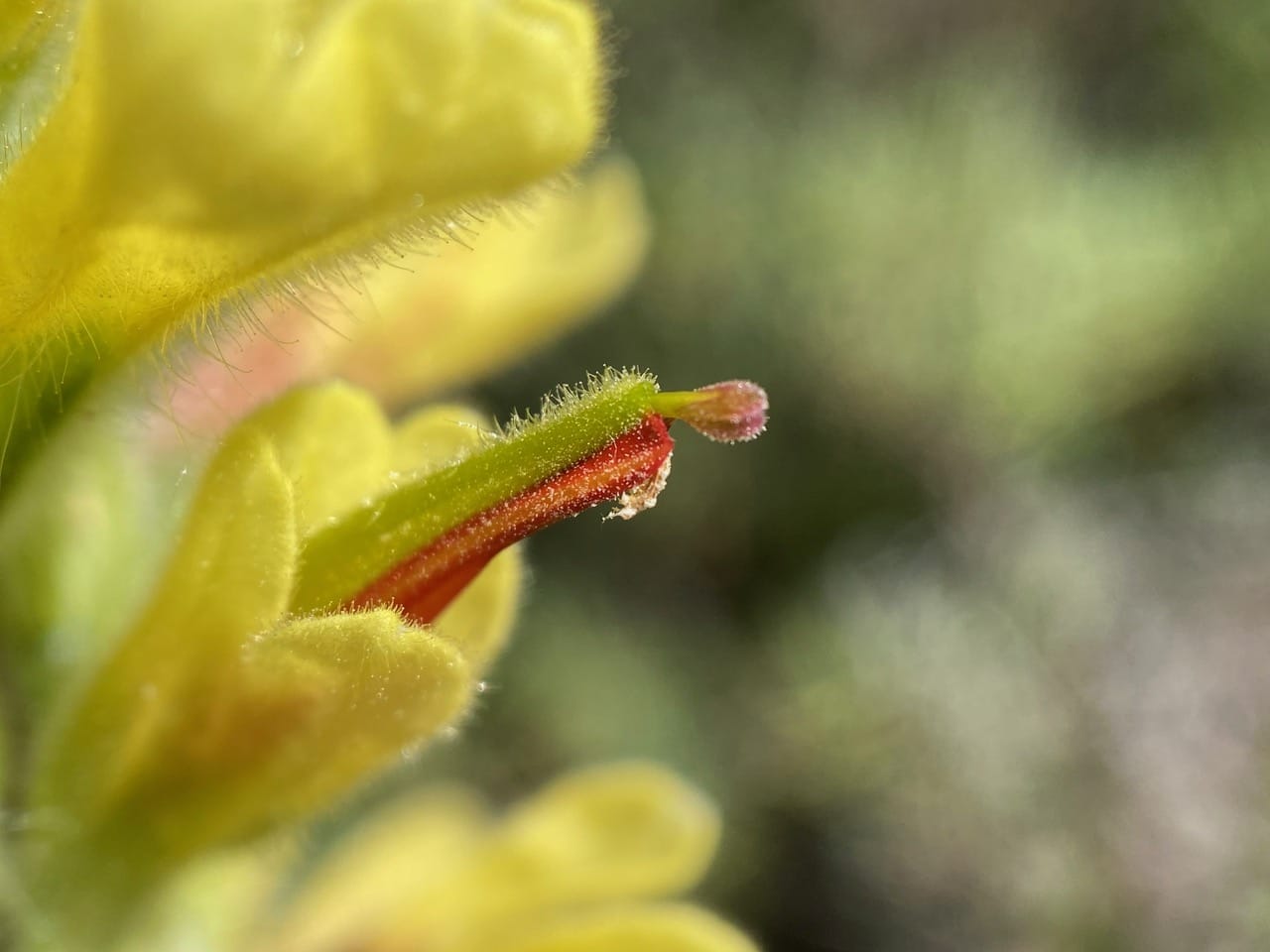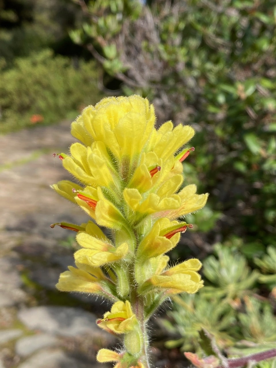 The yellow Coast Paintbrush, Castilleja affinis ssp. affinis is looking festive, with several green-and-red flowers peeking conspicuously from their yellow calyces.