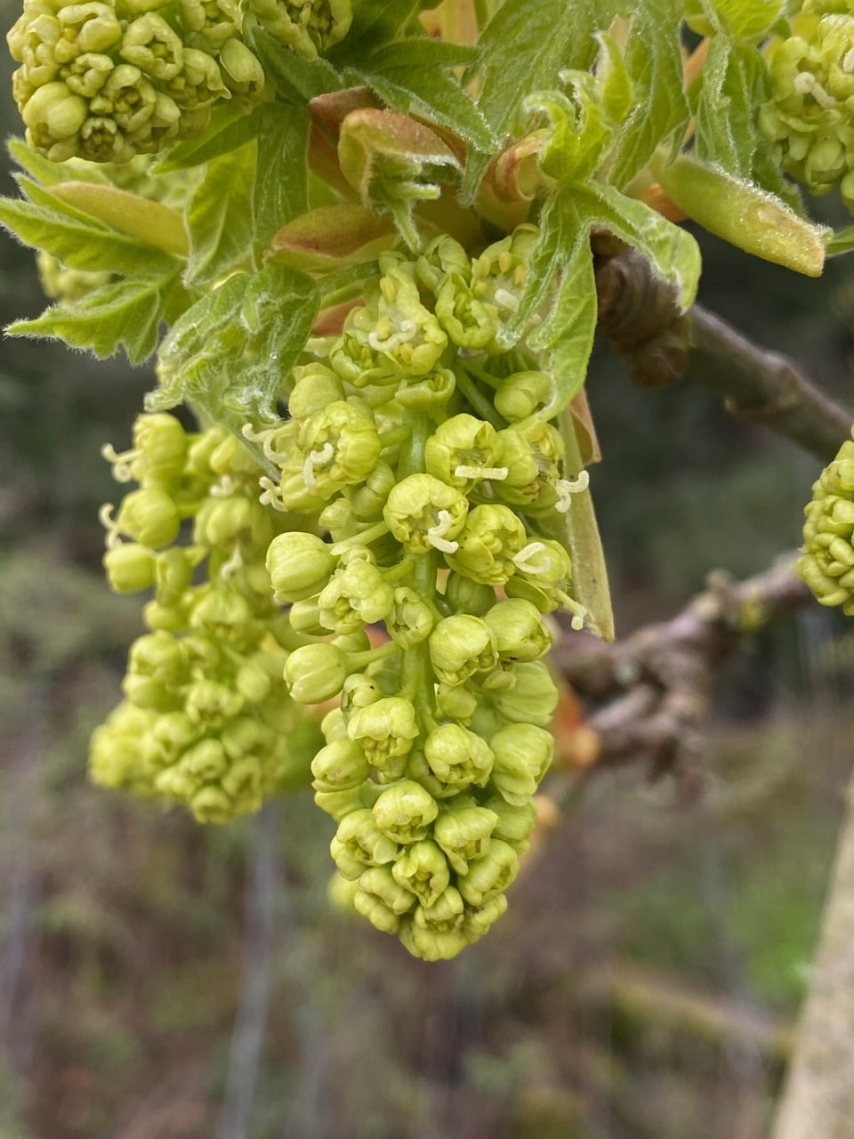 In front of the parking lot next to the footbridge over the stream, the large Big-leaf Maple, Acer macrophyllum is in glorious bloom, aglow with tender new leaves and hanging racemes of greenish-yellow flowers. I stop to examine the flowers up close. Hmm, this inflorescence seems to be made up of all male flowers, with prominent exserted stamens….. Aren’t the flowers supposed to be bisexual?