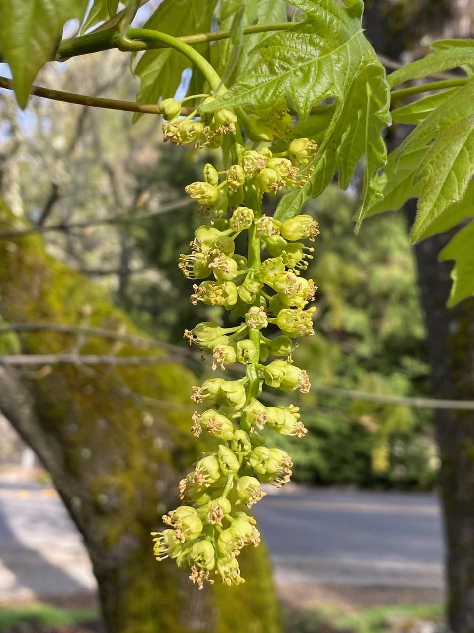 See the freshly opened flowers at the base of the pendant raceme? They are all displaying protruding whitish two-lobed styles – female reproductive structures that are receptive to pollen. Each is surrounded by tightly packed, immature stamens (male parts) in the cup-shaped corollas. Ah, now I get it! The flower of Big-leaf Maple is indeed bisexual, but the genders are separated in time to avoid self-pollination. This phenomenon is called dichogamy. The Big-leaf Maple flowers are protogynous, meaning the female parts mature before the male parts. In the female phase seen here, the flowers can only receive in-coming pollen from other flowers, possibly from the neighboring tree already well into its male phase. By the time the male parts mature and peek out of the corolla to release their pollen, the female parts would have shriveled up and are no longer functional. What perfect arrangement to ensure cross-pollination! And how fortuitous that I happen to come across two trees in different stages of floral development!