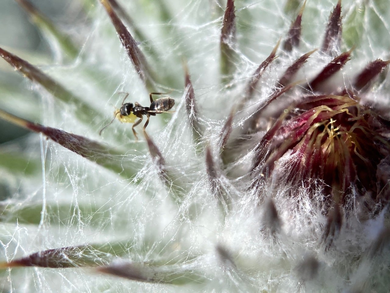 The ant makes it to the tip of the flowerhead, but does not deposit the aphid there. It continues on its arduous journey.