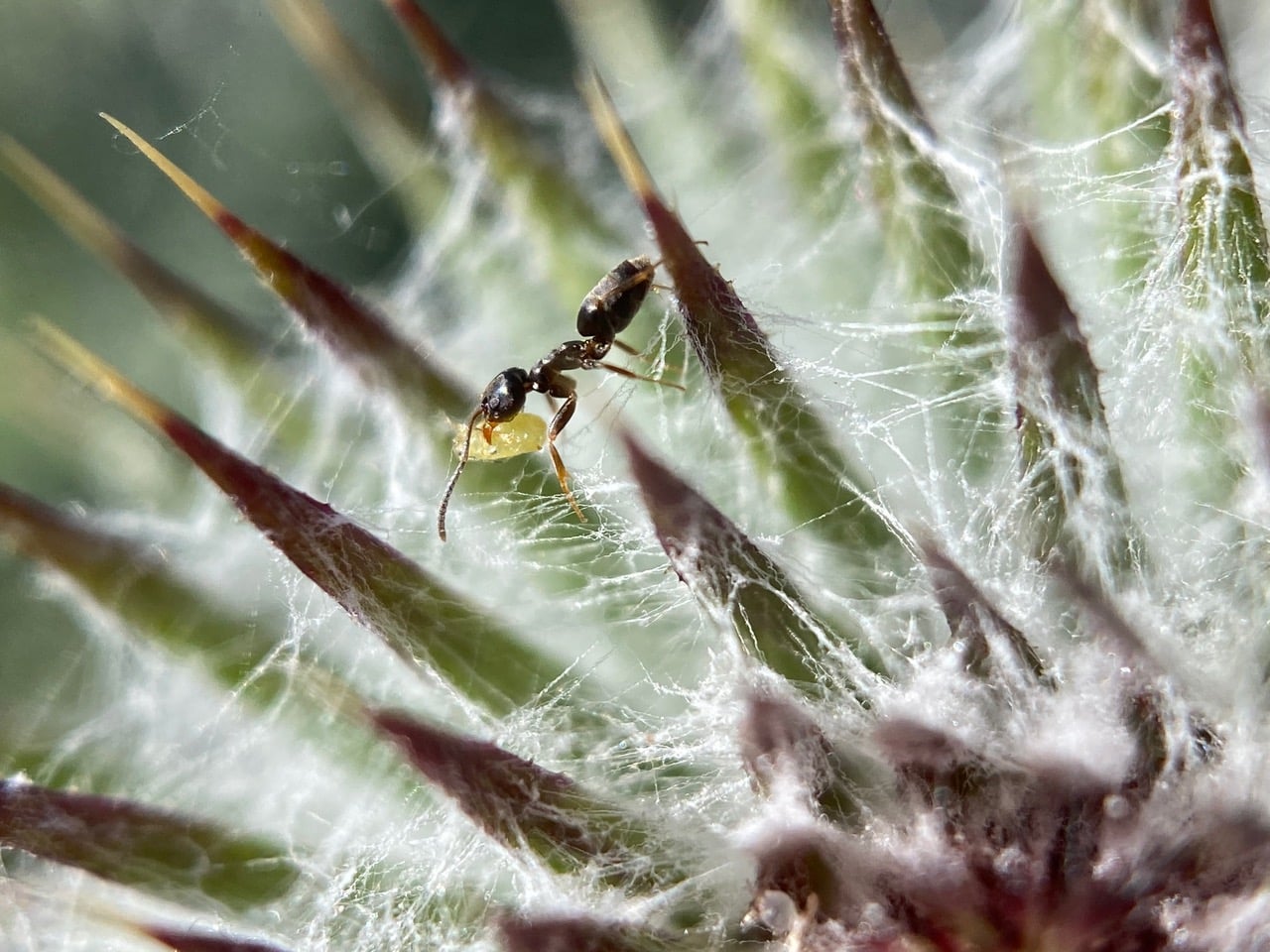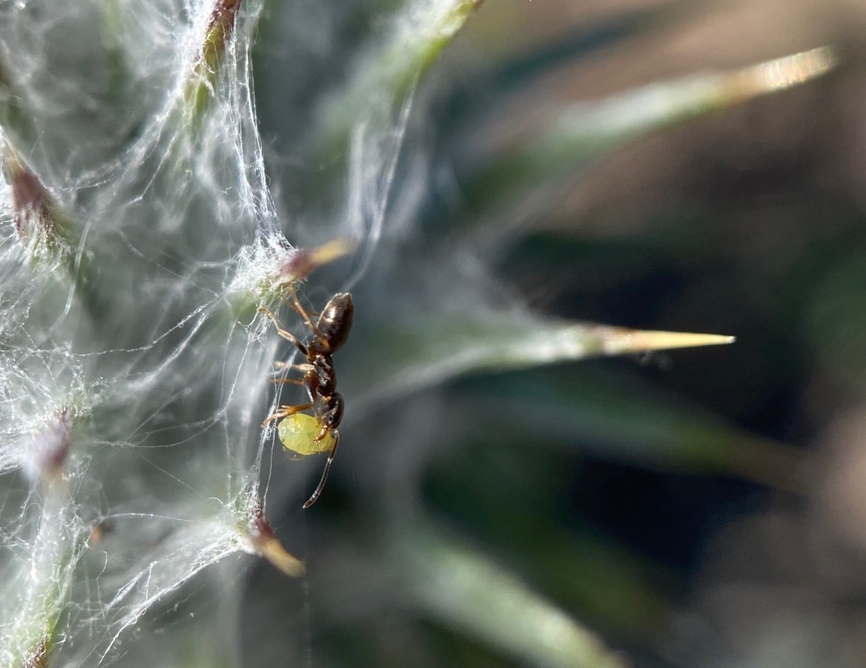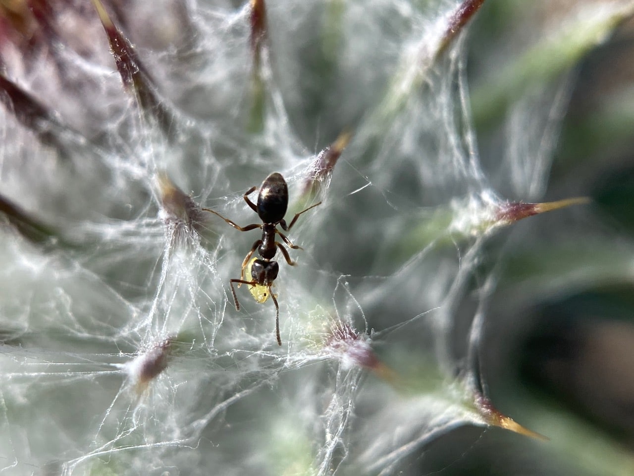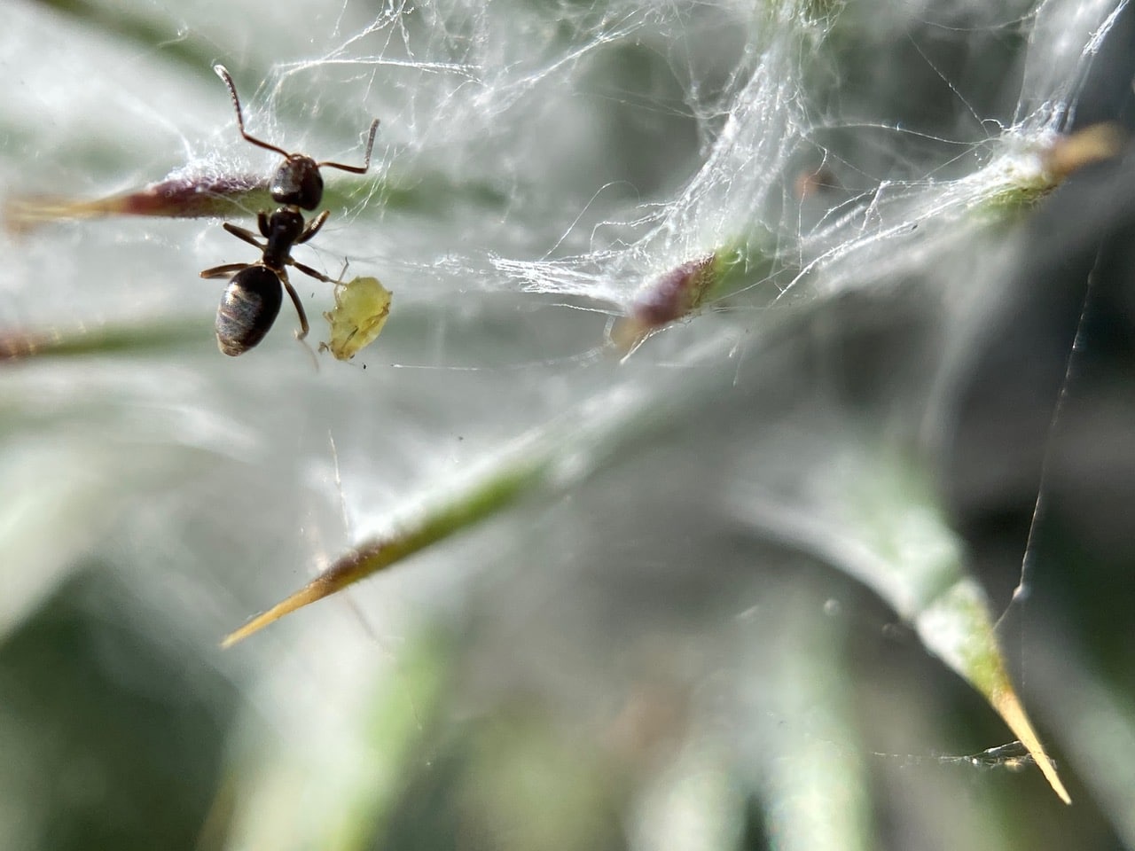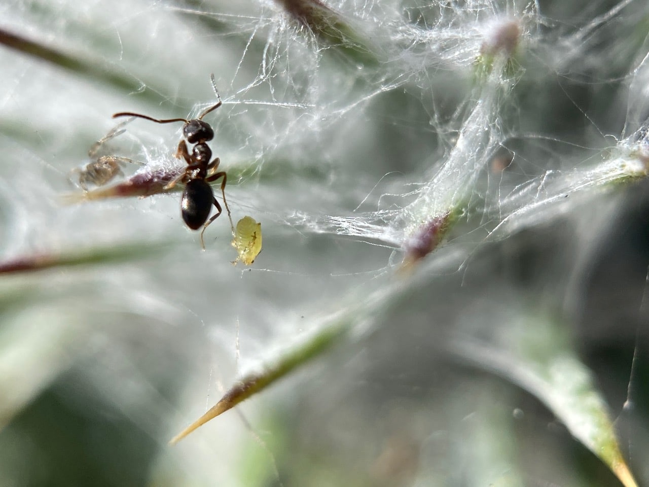 Navigating the webby terrain with difficulty, but determination, this ant is carrying something in its jaws.