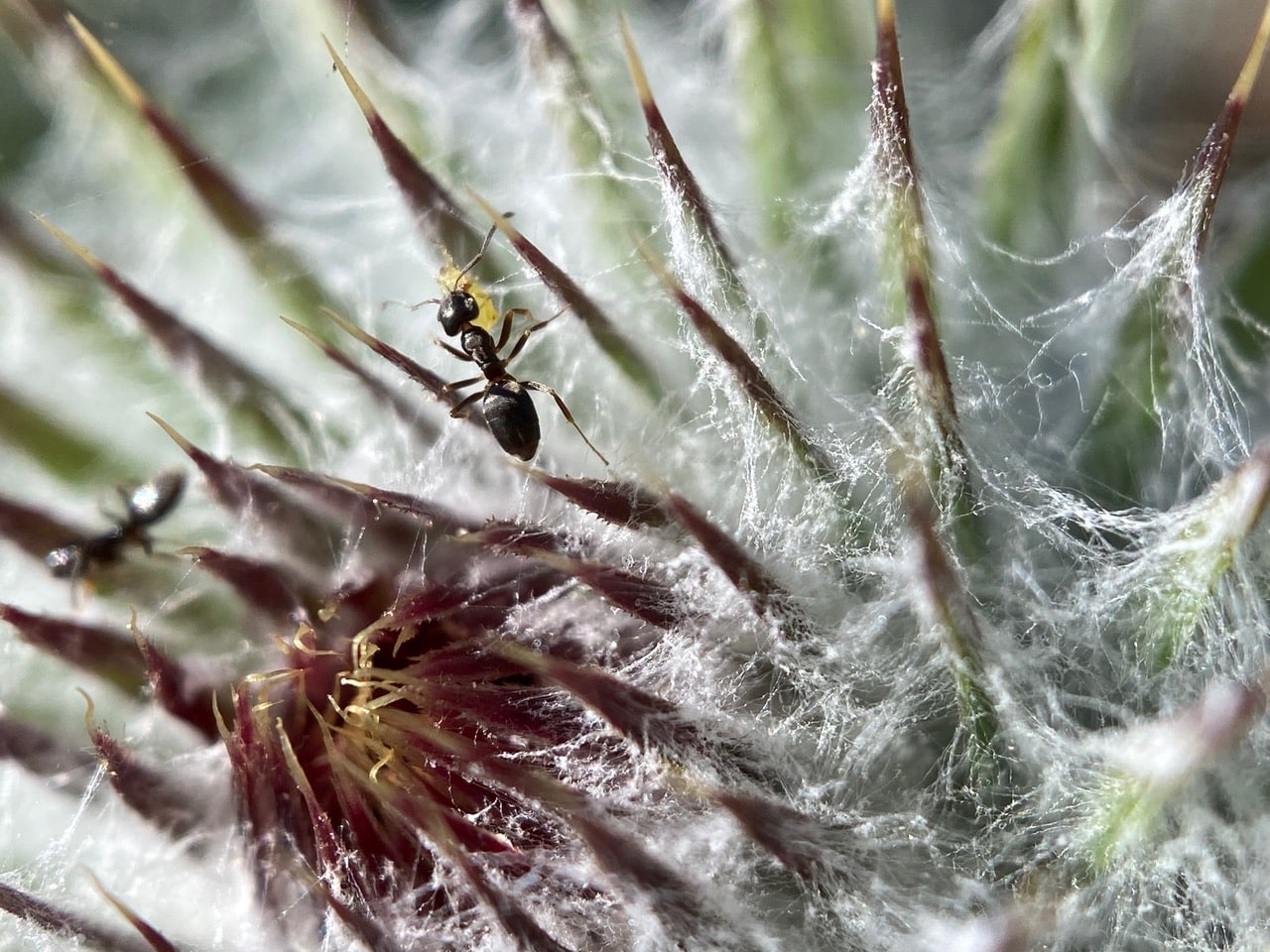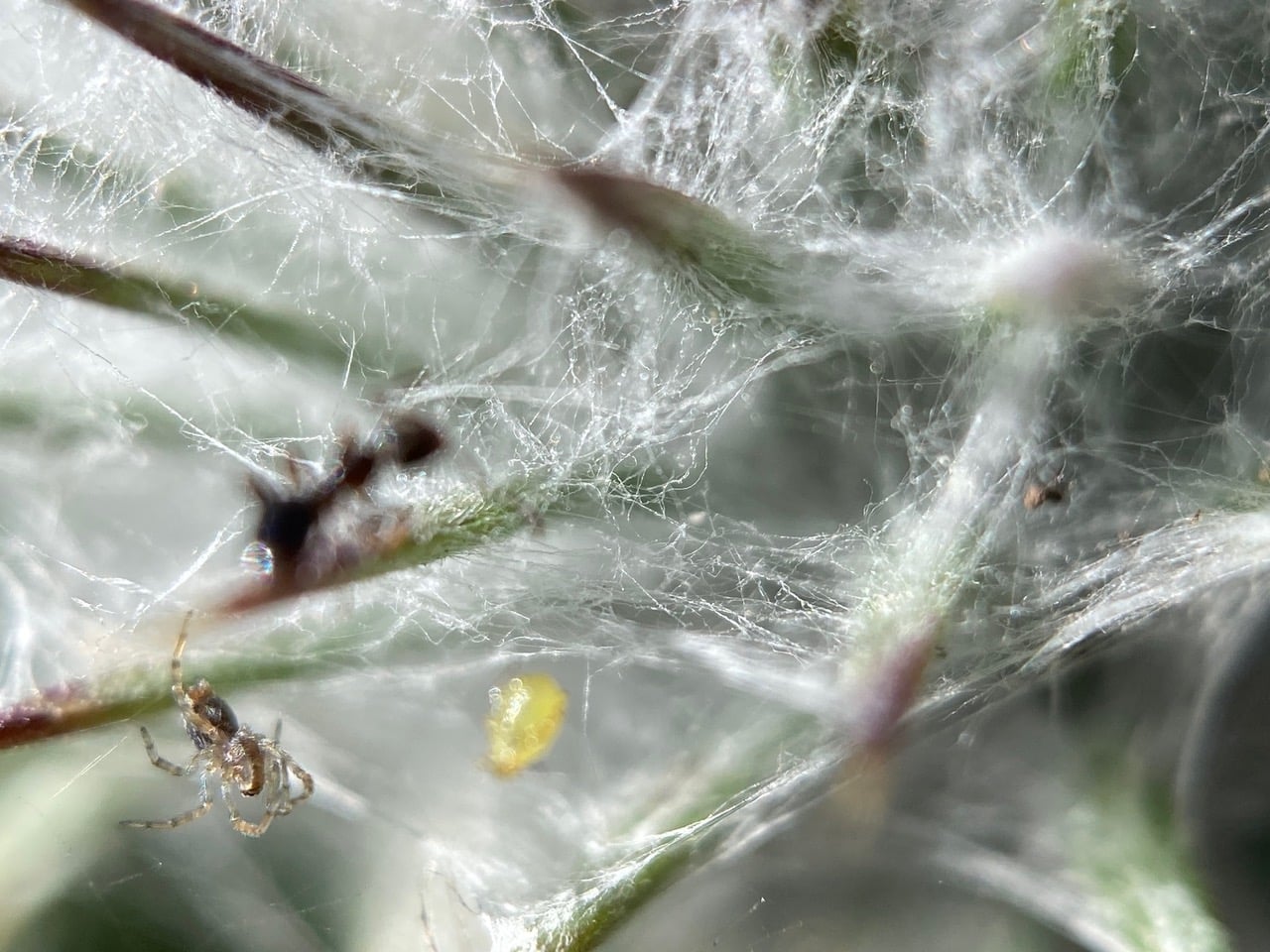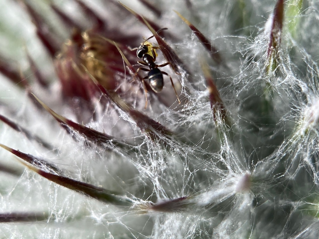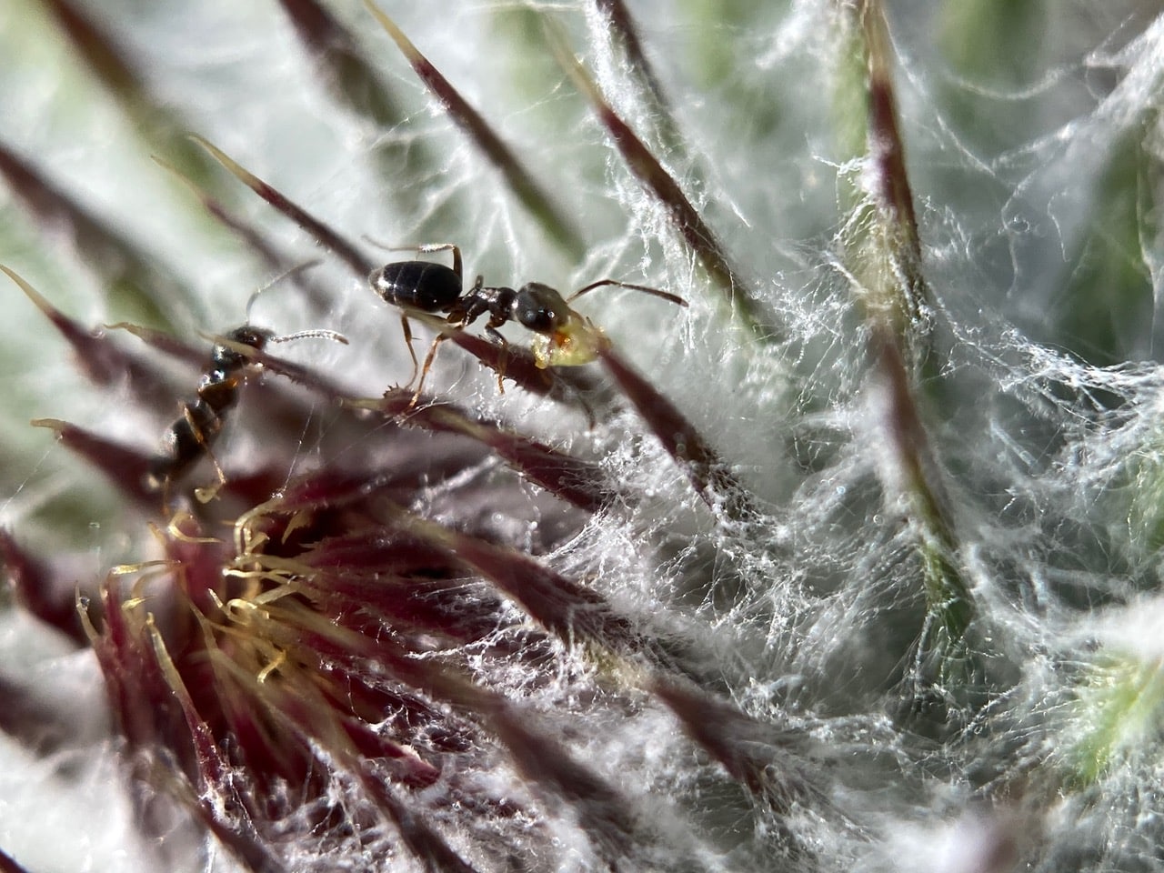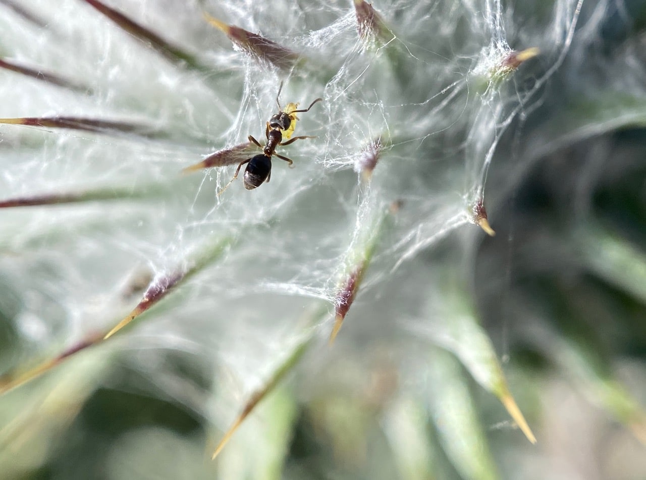Navigating the webby terrain with difficulty, but determination, this ant is carrying something in its jaws.