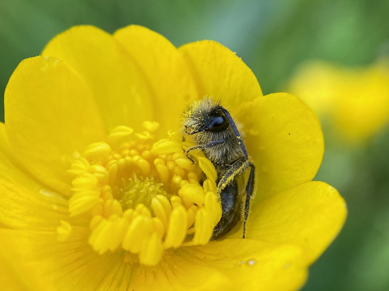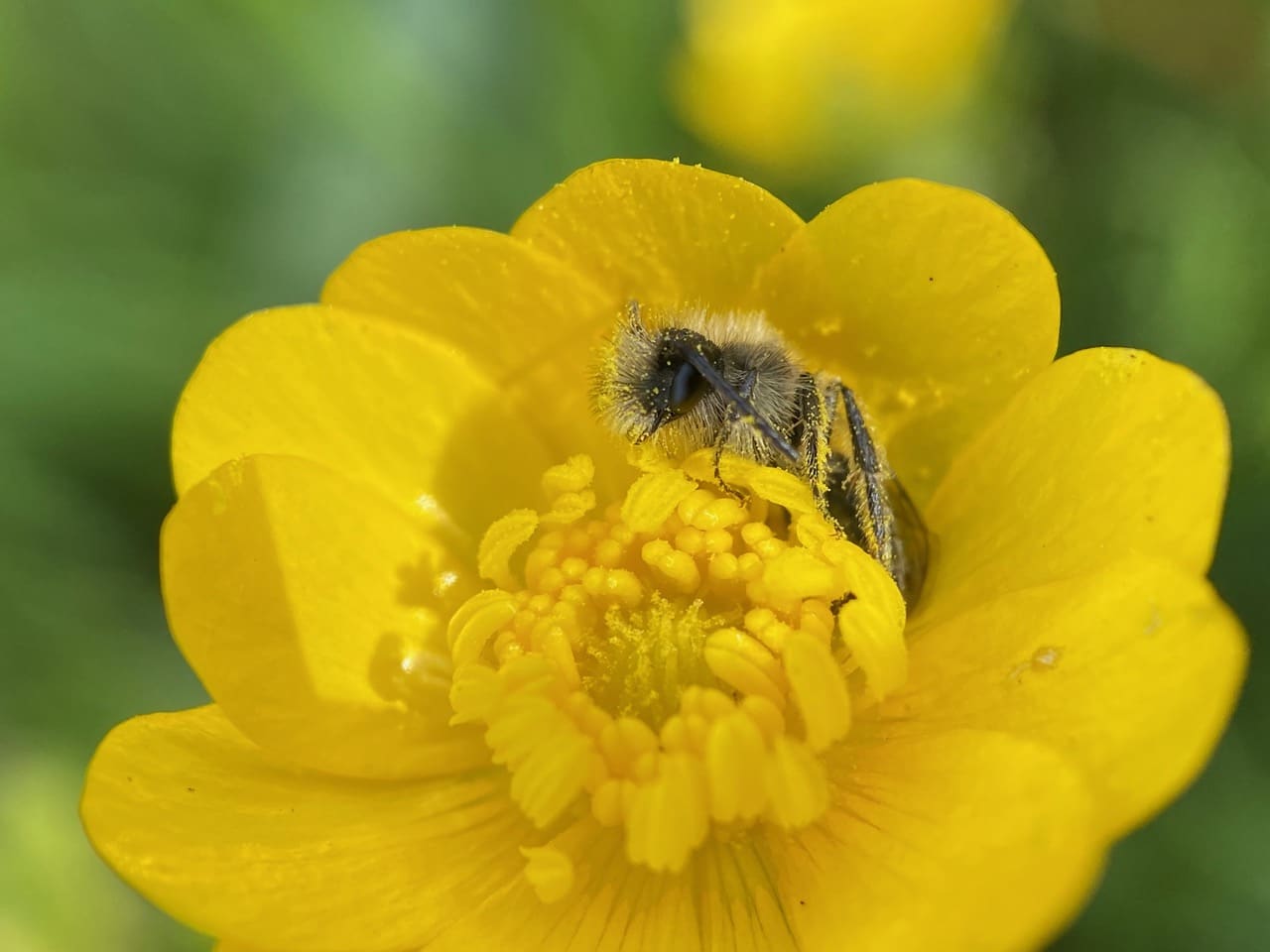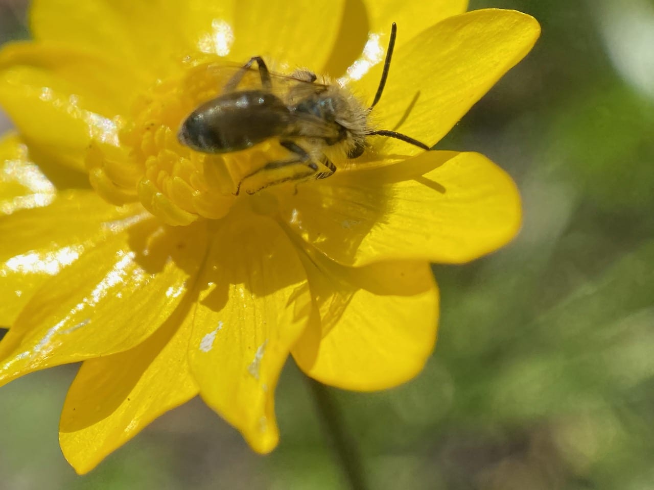 There is a small, slender bee that is flying around, persistently visiting the buttercup flowers. It is fast and wary, almost impossible to get close enough for a photo. From its long antennae, I gather that it is a male.
