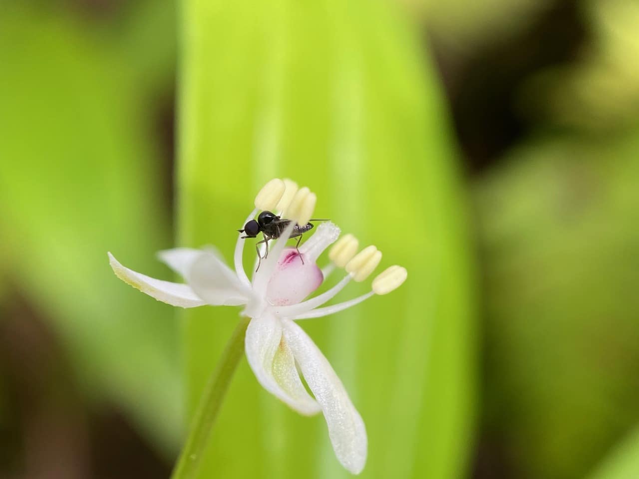 The Hybotid Dance Fly is perched atop the bulbous ovary of the Star-flowered Lily-of-the-Valley. Note the stigma on top of the short, stout style – it looks viscid and ready to receive incoming pollen.