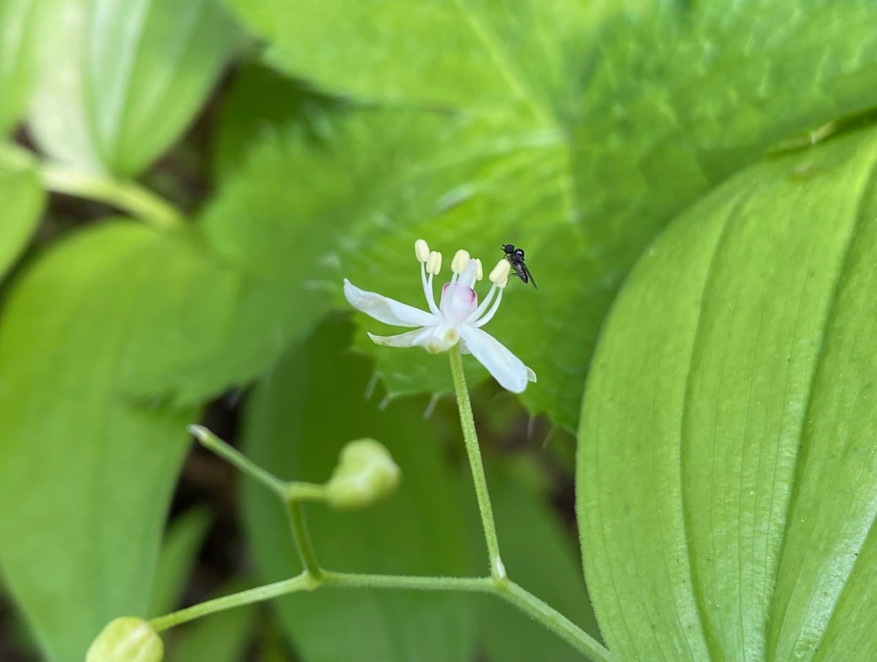 In a shady area along the trail, some Star-flowered Lily-of-the-Valley, Maianthemum stellatum are beginning to open up small white flowers along arching stalks. Guess who’s on top of that flower?
