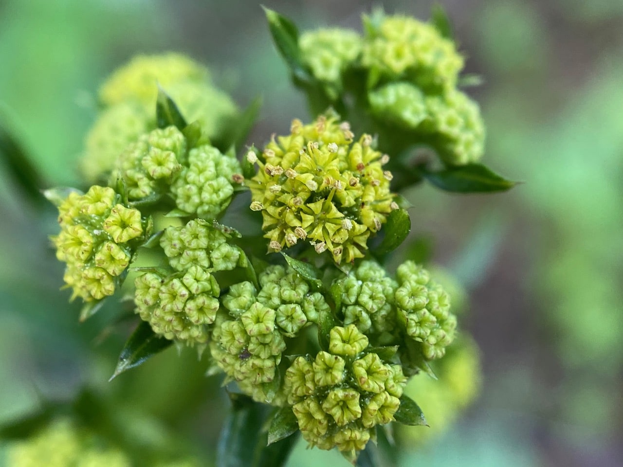 So common along the trail, the Pacific Sanicle, Sanicula crassicaulis, is blooming in profusion now. It takes patience to scan the tight clusters of minute flowers to find any insects. The mature flowers have fully exerted anthers.