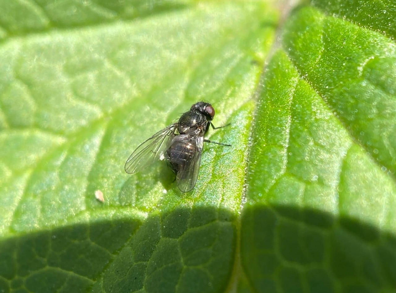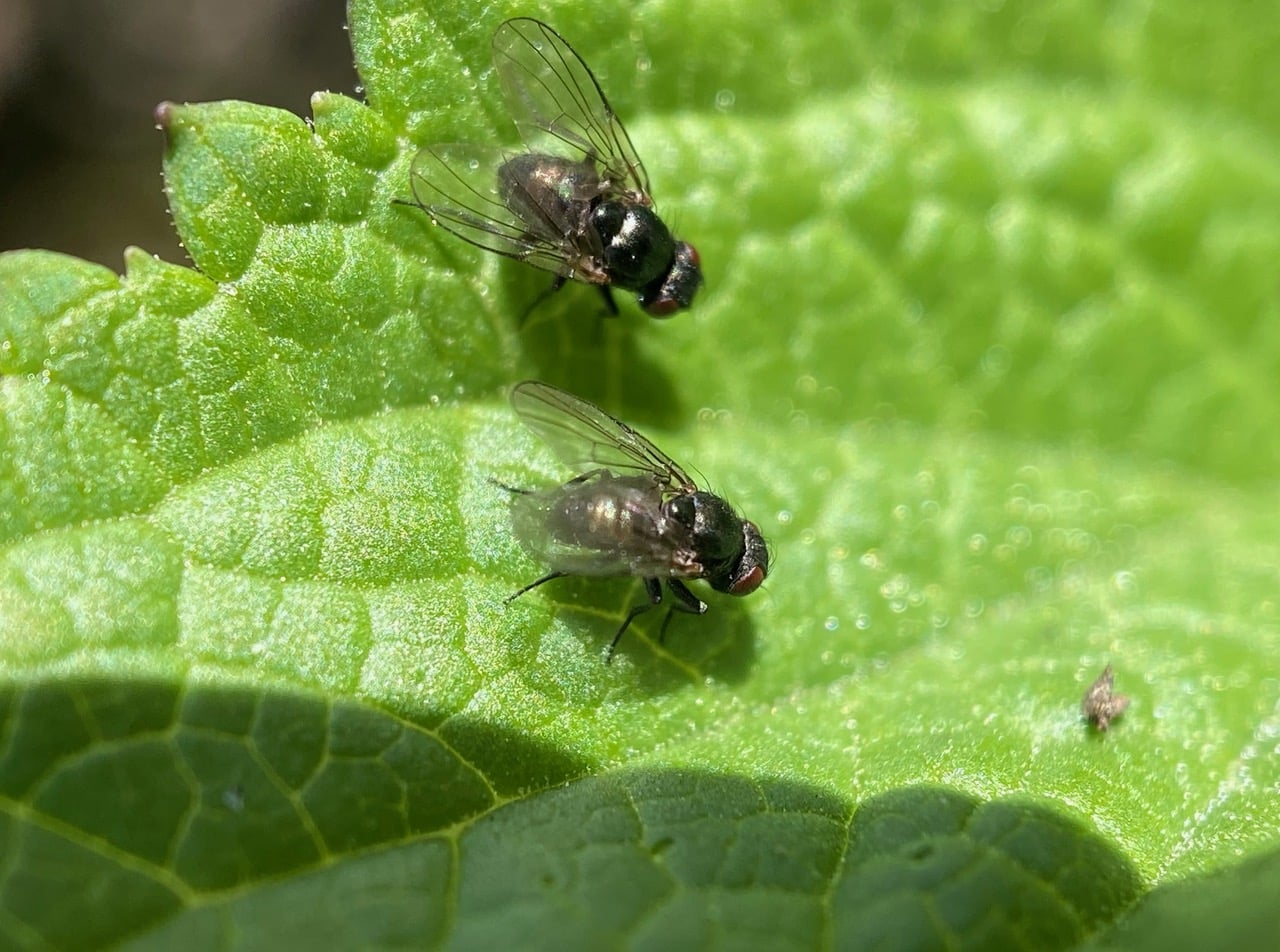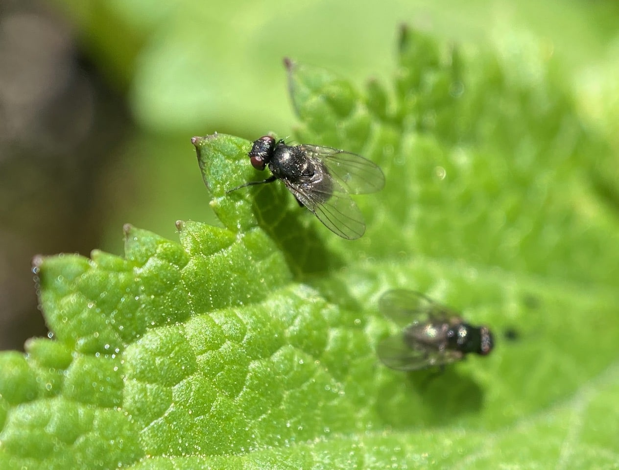 Three tiny flies are perched on a Bee Plant leaf. For this size, I suspect Leafminer Flies in the family Agromyzidae.