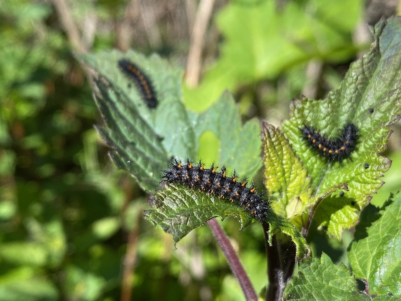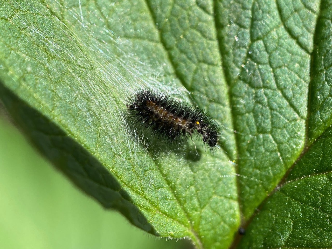 Wow, the Variable Checkerspot caterpillars have really ravaged this California Bee Plant, Scropularia californica. It is interesting that some of the Bee Plants are left totally untouched, while a few are crawling with caterpillars. These caterpillars have overwintered in the leaf litter. How did they decide which plants to climb on to feed when they woke up from diapause? Usually it is the mother butterflies’ choice on where to lay their eggs (usually favoring the plants with the appropriate level of defensive chemicals to provide protection for their larvae). These are smart, independent caterpillars that know what’s good for themselves!