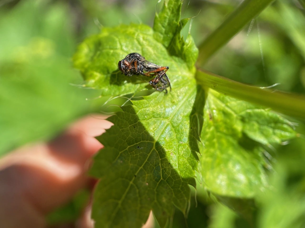Passing a blooming Pacific Sanicle, Sanicula crassicaulis, I spot something dark on a leaf. Wow, it is a dead March fly that has been wrapped in silk. Victim of a spider? The packet must have been cut off from a web above. Since Crab Spiders and Jumping Spiders do not wrap up their prey, they are not responsible.