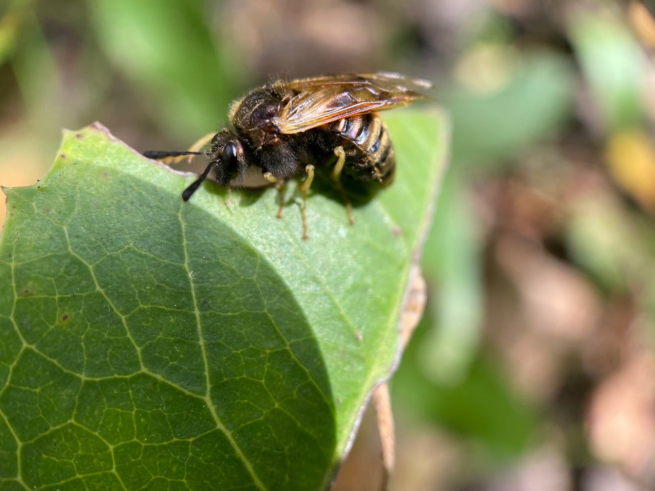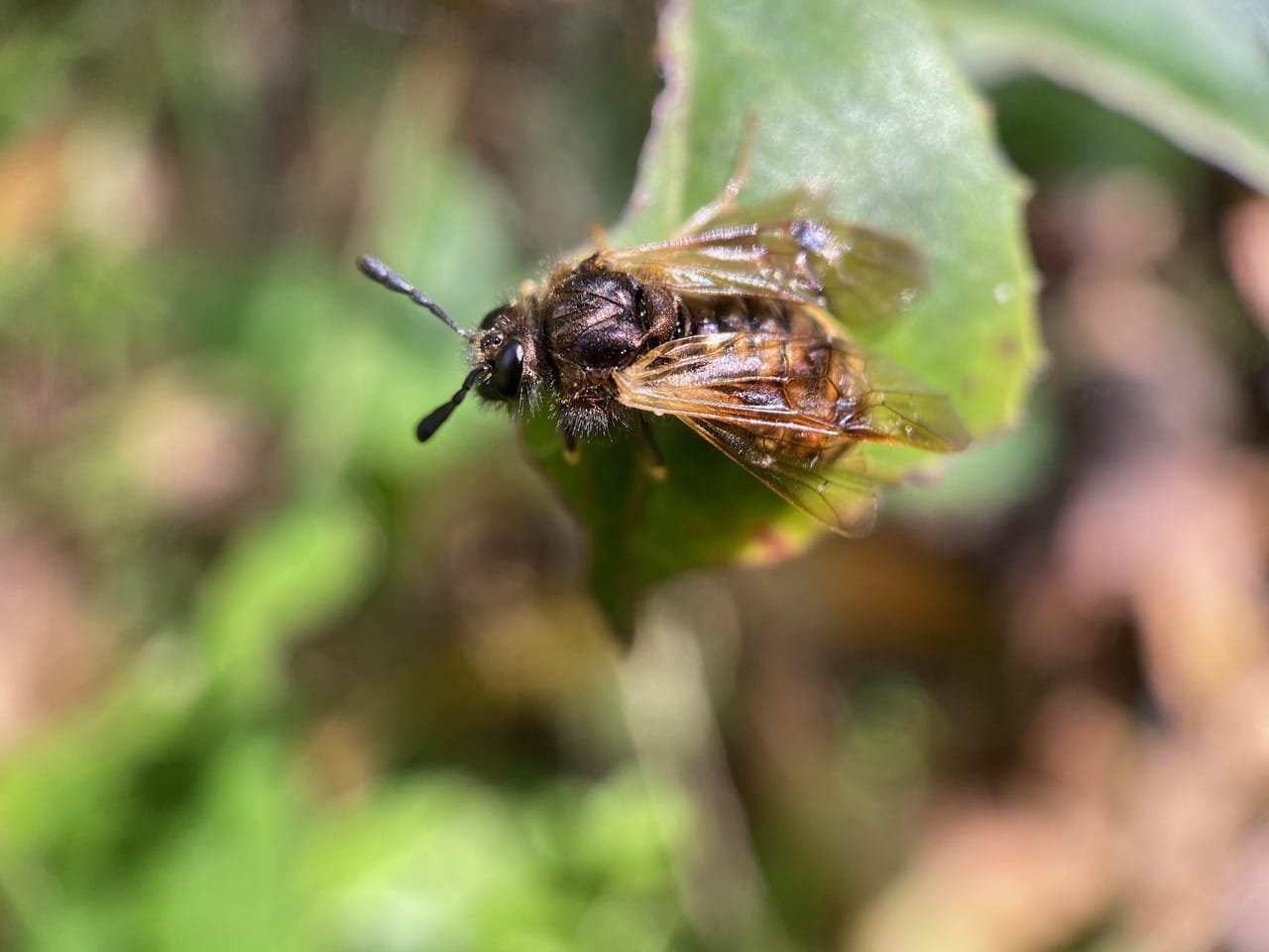 Who is this insect lurking on a Toyon leaf? It is about the size and shape of a bumble bee, but what’s with those clubbed antennae? The insect is glossy black with metallic gold bands on its abdomen. I can’t even place it in any taxonomic group I can come up with!
