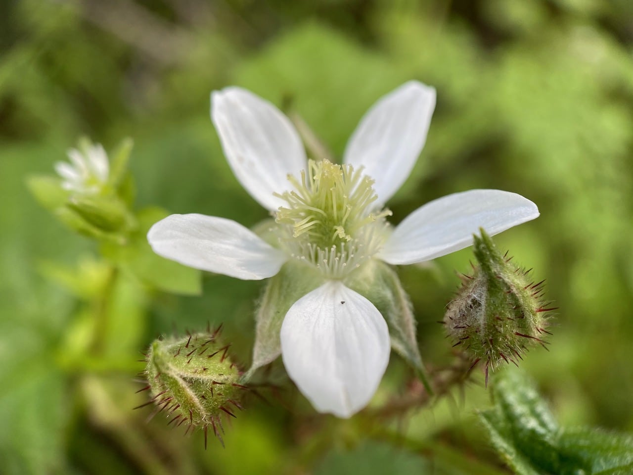 A female California Blackberry, Rubus ursinus has started to bloom. The species is dioecious, with male and female flowers borne on separate plants. Female flowers (as shown here) have smaller petals and a central cluster of many pistils. Male flowers have larger petals and a central cluster of many stamens. It takes close examination to distinguish the sexes.