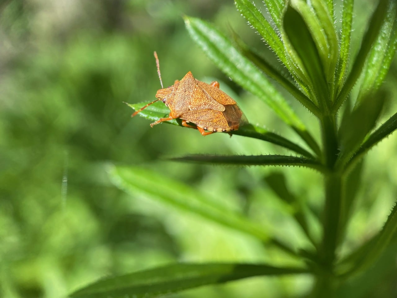 A Spined Soldier Bug is resting in a sunlit spot on a leaf of Bedstraw.