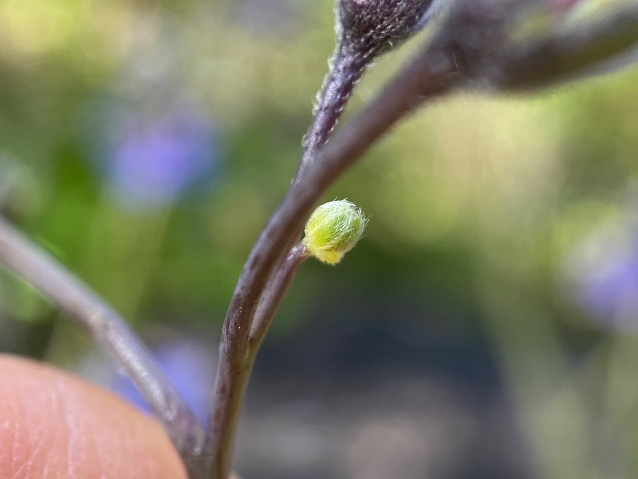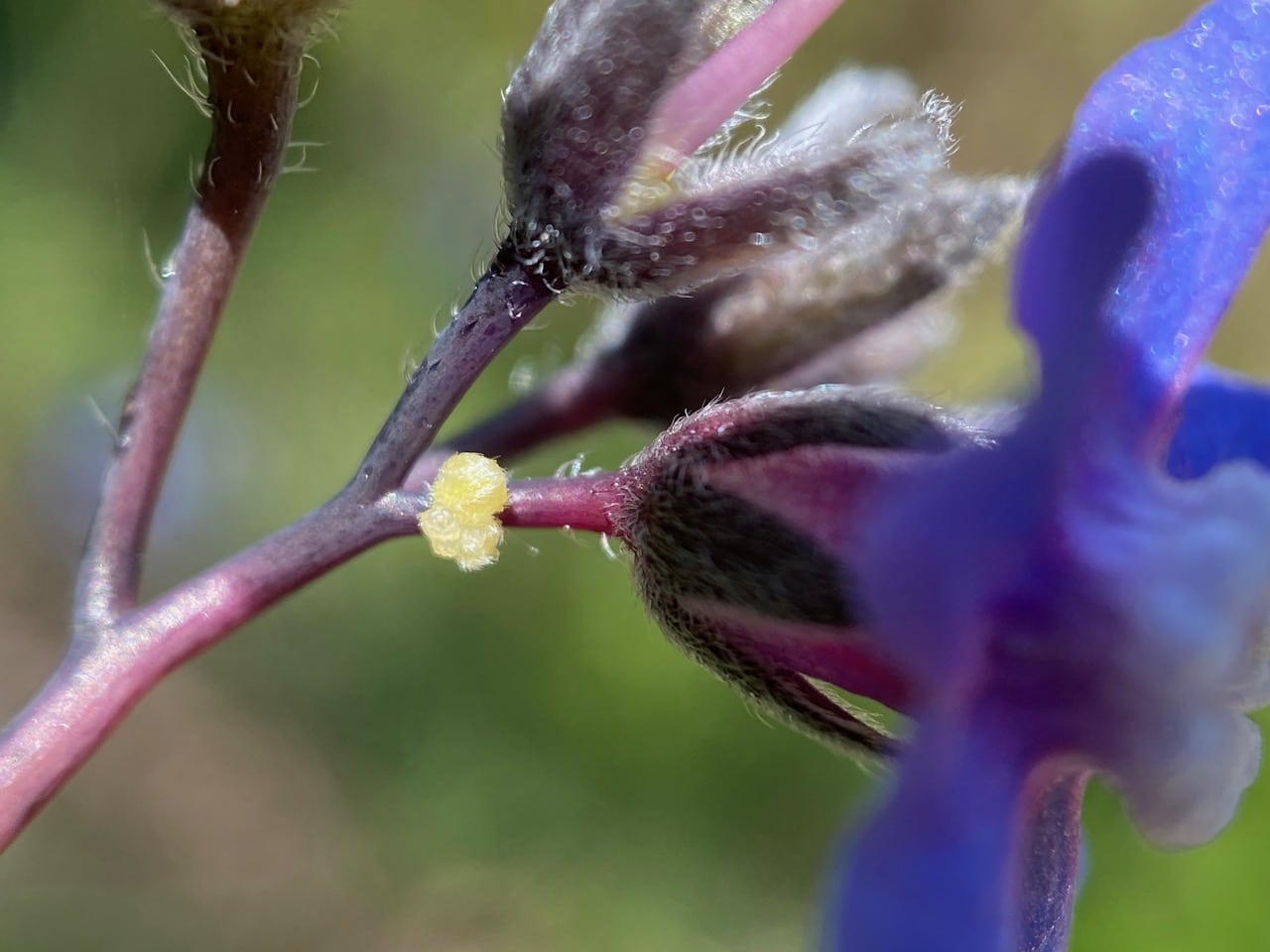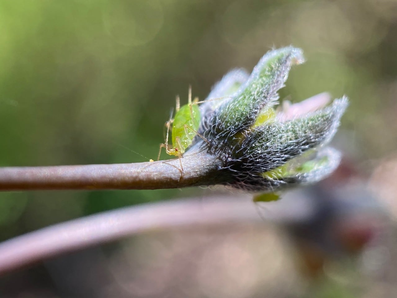 Hey, there’s an aphid at the base of the calyx of this spent Hound’s Tongue flower that has shed its petals. There are smaller aphids behind her. The big aphid has its rostrum firmly buried in the tissue of the pedicel, obviously feeding.
