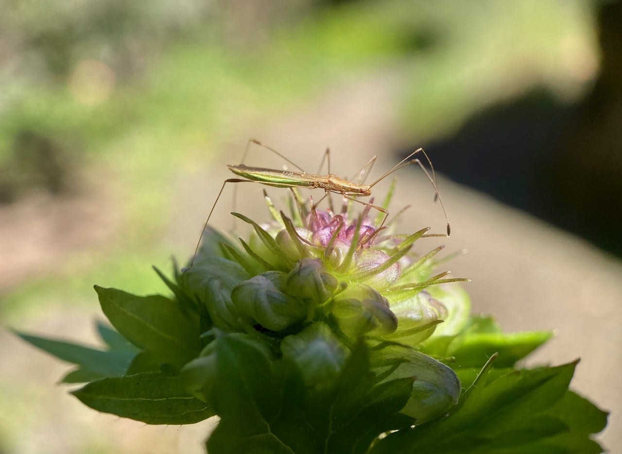 A mere sliver of an insect, a Stilt Bug, Neoneides muticus (family Berytidae) is perched atop an inflorescence of an unidentified plant on the path. Note the long, sharp rostrum, the piercing-sucking mouthpart folded under its body. The mouthpart is characteristic of “true bugs” in the order Hemiptera.