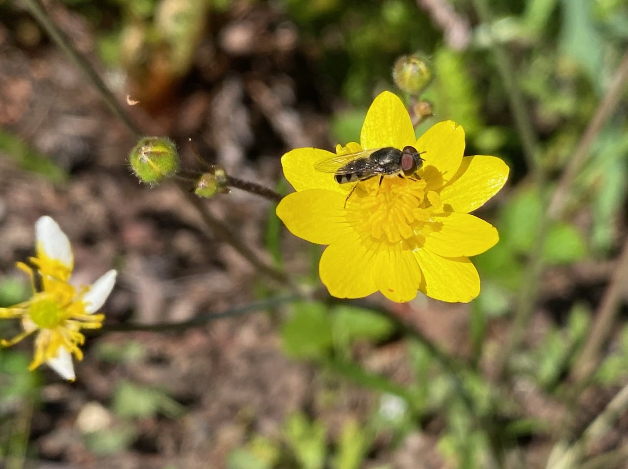 A few California Buttercup, Ranunculus californicus along the path are in bloom. A Sedgesitter, Platycheirus sp.(family Syrphidae) is feeding on pollen from the stamens.