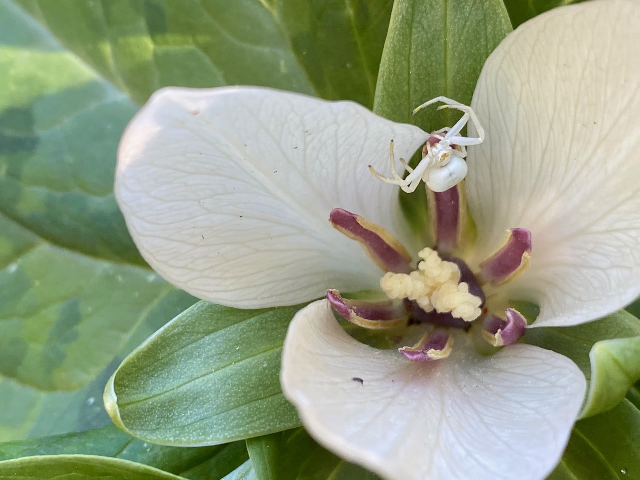 Hey, there’s a Crab Spider (family Thomisidae) in that white-flowered Giant Trillium, Trillium chloropetalum. The presence of the predator reassures me that these flowers are being visited by insects.