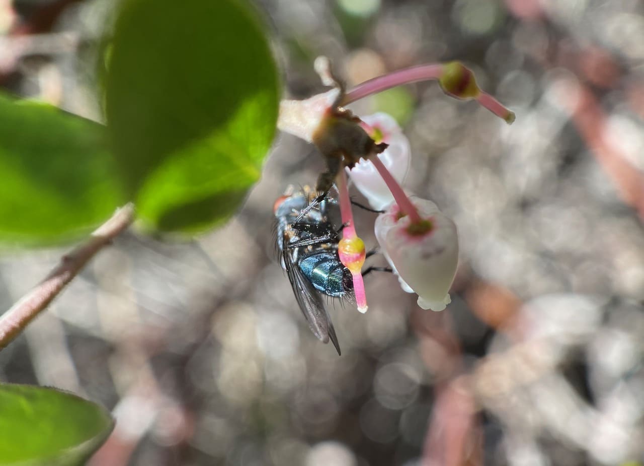 Though hardly ever talked about, the Bluebottle Fly, Callifphora sp. (family Calliphoridae) is probably one of the most common visitors to the manzanita flowers.