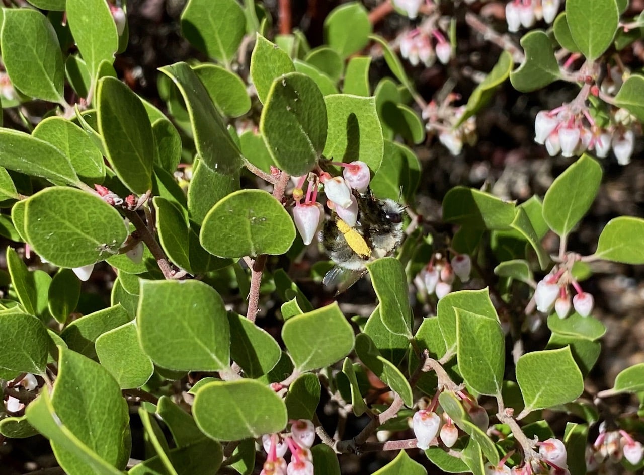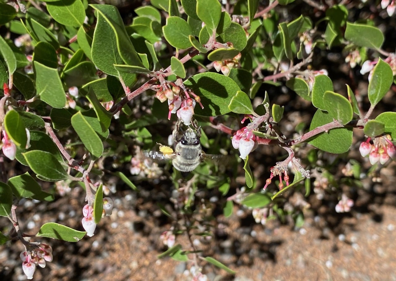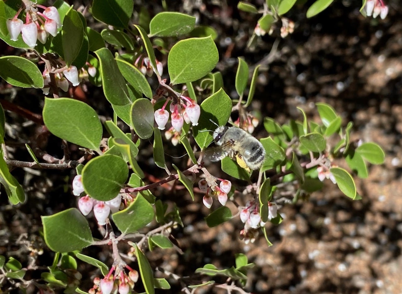 This late-blooming manzanita is still attracting numerous pollinators, notably the Pacific Digger Bees, Anthophora pacifica (family Apidae). Compared to earlier in the season, there are a lot more females than males now. See the yellow pollen load on this female’s hind leg? Male bees do not collect pollen; neither do they have the anatomy for the job.
