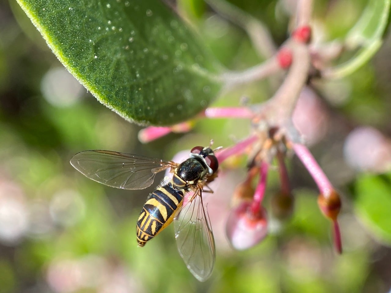 An Oblique Streaktail, Allograpta obliqua (family Syrphidae) has landed on a senescing manzanita inflorescence. Although small in size, the hover fly is easy recognizable for the unique pattern on its black-and-yellow abdomen. It is a female, as evident from its dichoptic eyes (not meeting each other on top of the head), and the plumper abdomen with a pointed tip.