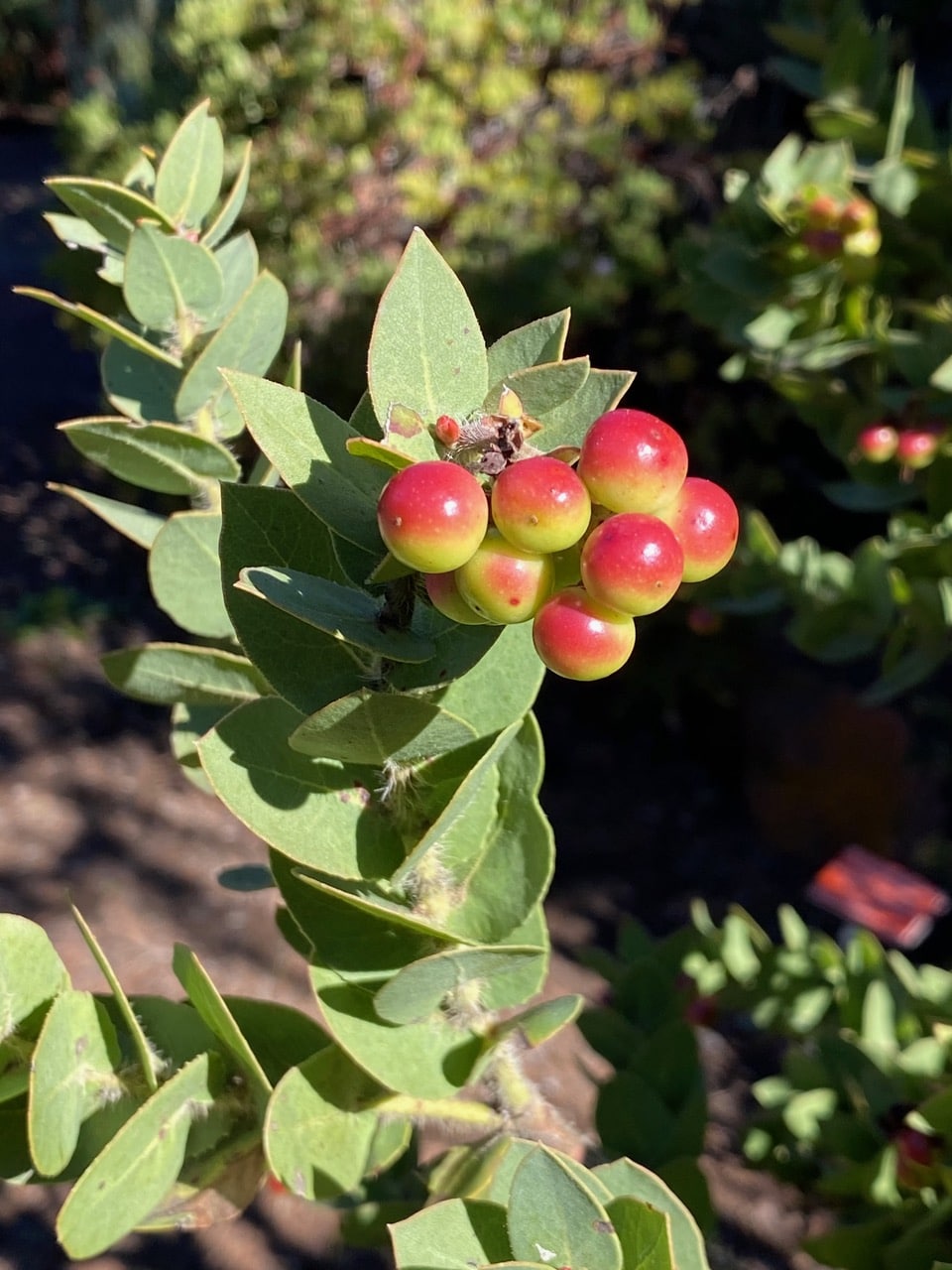 Most of the manzanitas in the garden are finished blooming, and well on their way to developing fruits. Luscious “little apples” are ripening on the tip of this manzanita branch. Manzanita is a common name for many species of the genus Arctostrphylos. The word manzanita is the Spanish diminutive of manzana meaning “little apples”. Manzanita fruit is technically a drupe, which means it has a large seed in the center surrounded by fleshy tissue and thin skin. Many animals eat manzanita fruits, including bears, deer, birds, and rodents. Coyotes and foxes help disperse the seeds in their droppings.