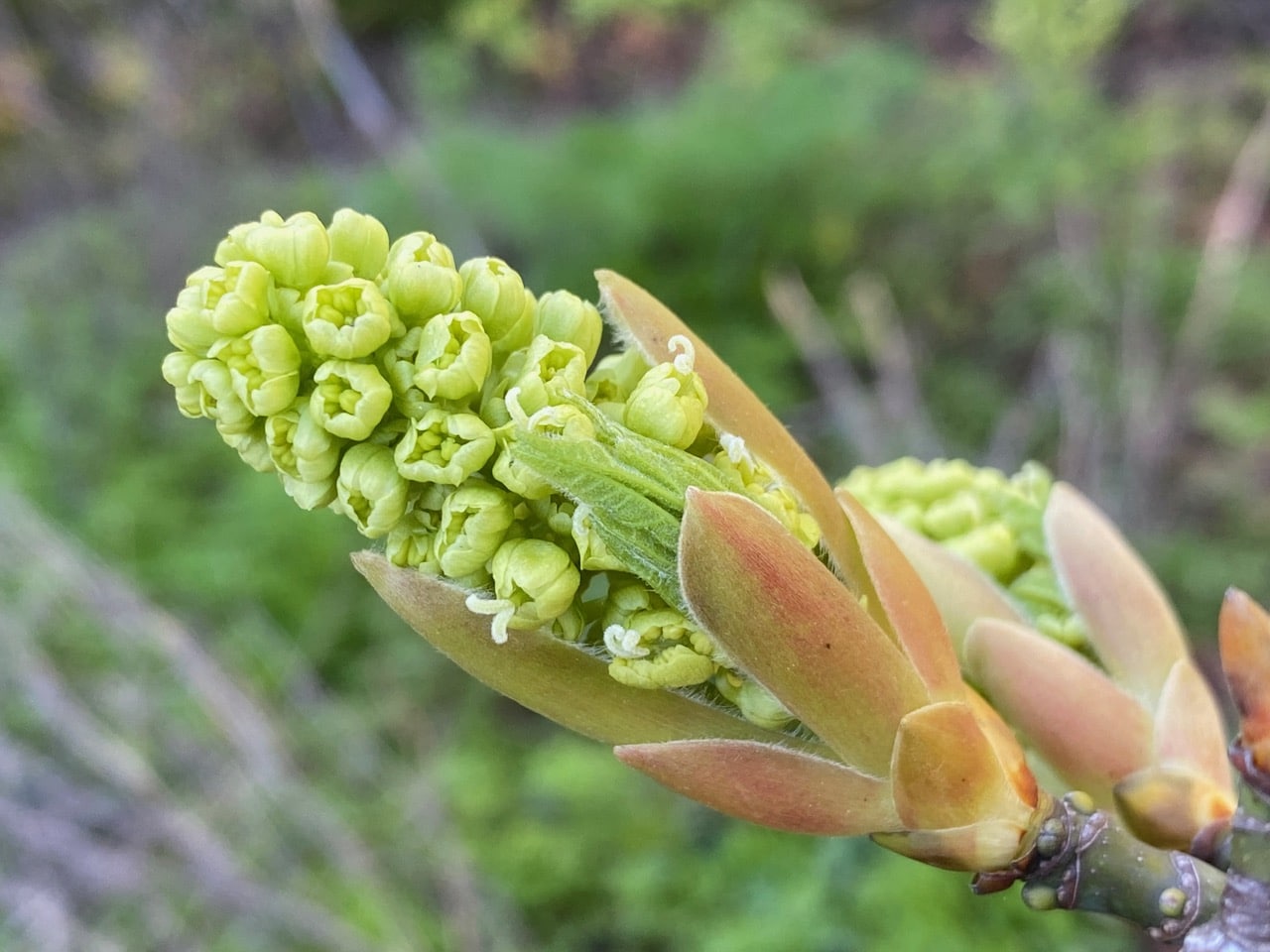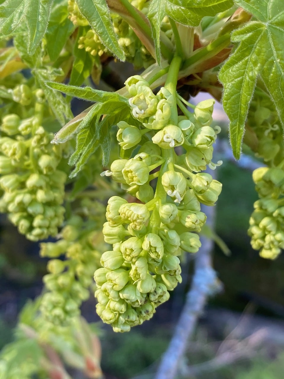 Ah, budburst is still occurring on the Big-leaf Maple, Acer macrophyllum near the parking lot. Checking on the emerging inflorescences confirms my previous observations that the flowers are all bi-sexual, containing the reproductive structures of both sexes. However, the ones to mature first are exposing their female parts first (see those squiggles of white styles), followed by the male parts (pollen releasing stamens). The sequence is indicative of a species that is protogynous (“female-first”). The temporal separation of the genders is the plant’s strategy for avoiding self-pollination.