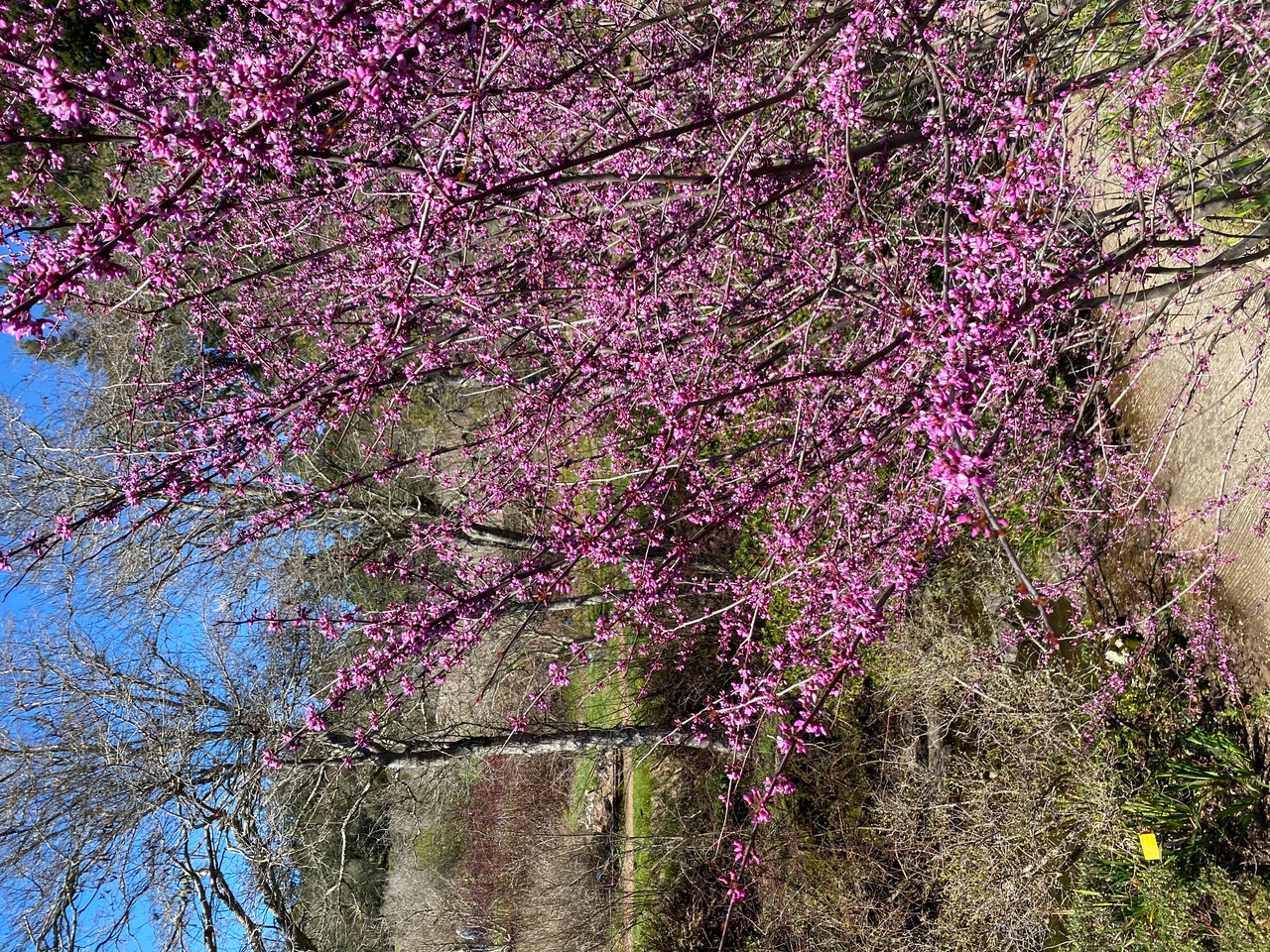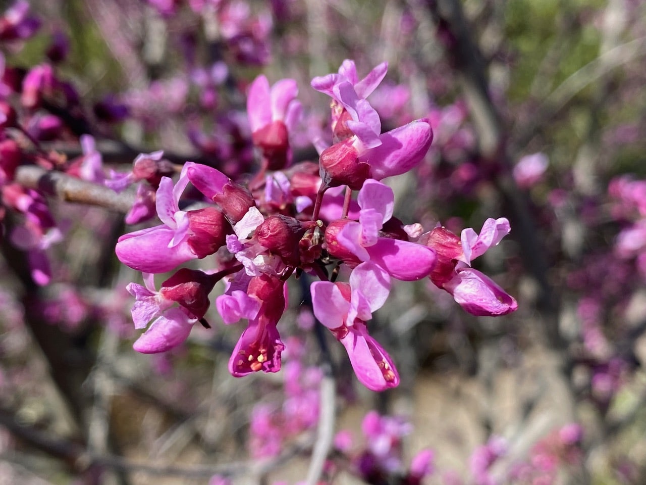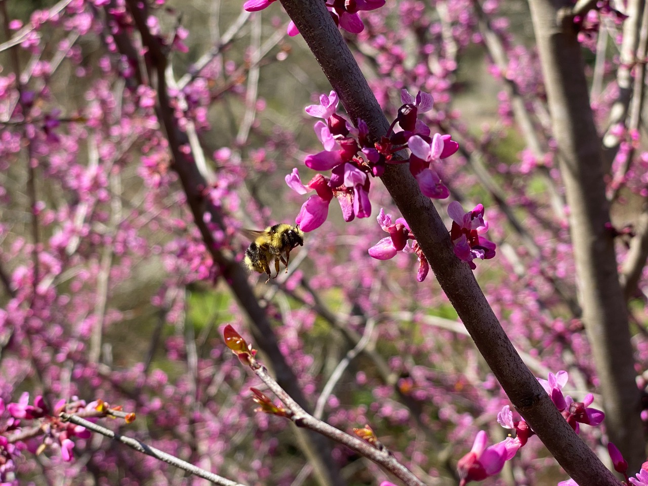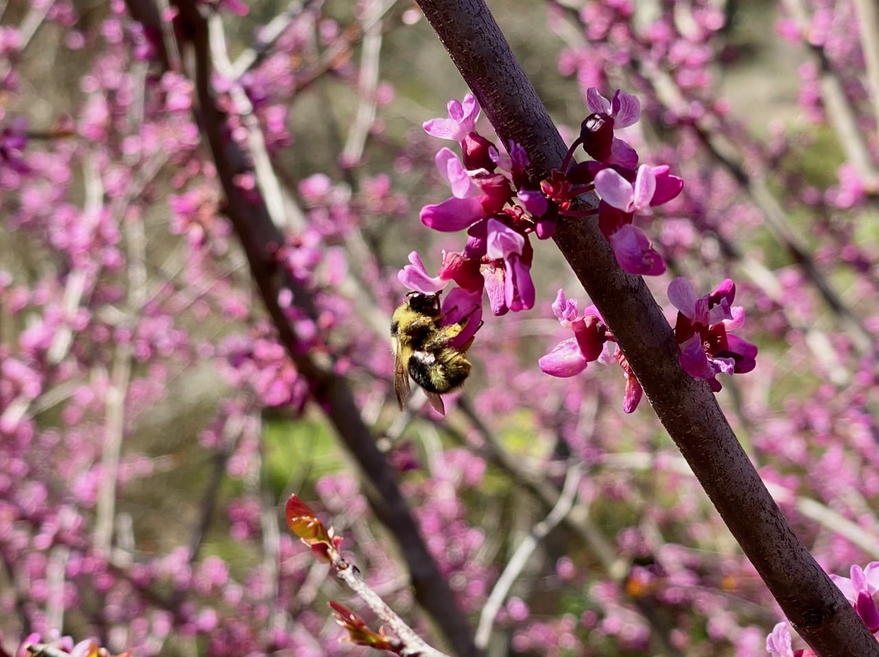The gloriously blooming Western Redbud, Cercis occidentalis is abuzz with bees! I position myself on the upper trail next to the large shrub where I can look right into the branches.
