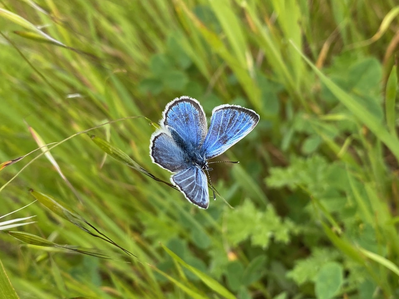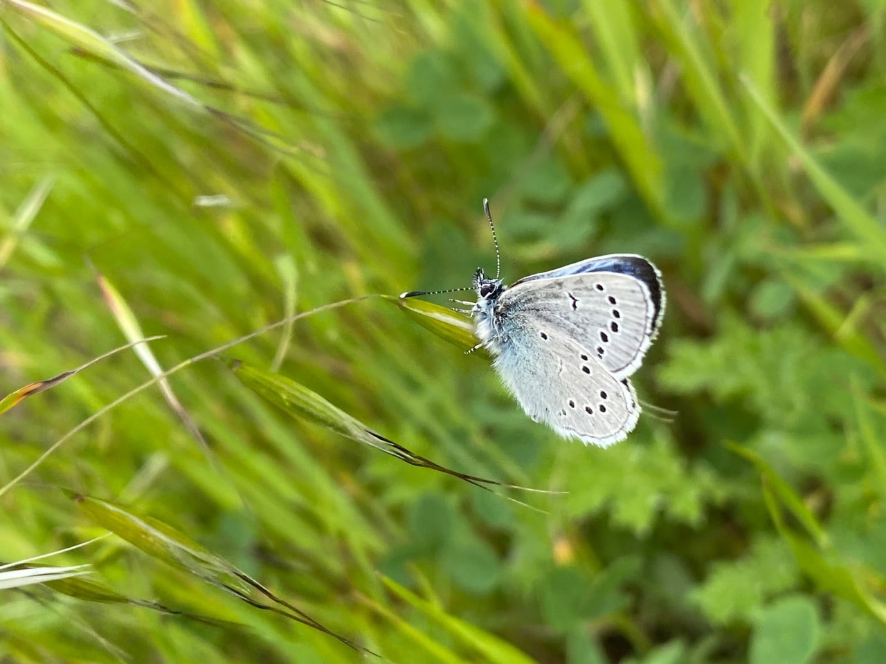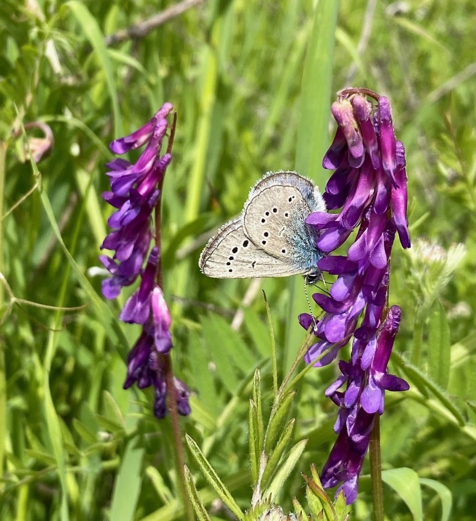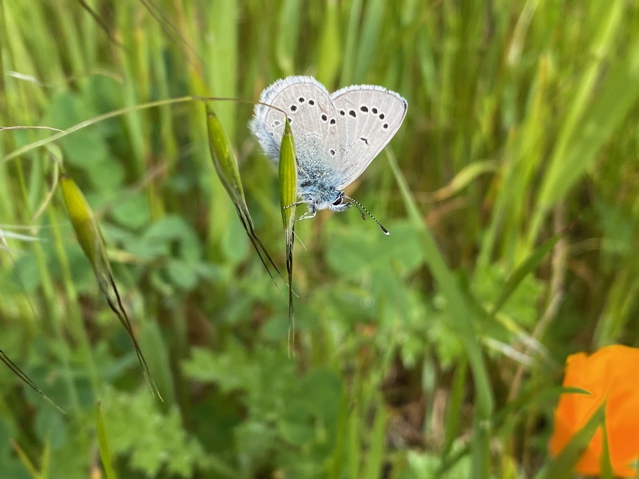 Nearby, I spot a glint of brilliant blue among the tall grasses. A male Silvery Blue butterfly is perched on a drooping seed head, waving in the breeze.