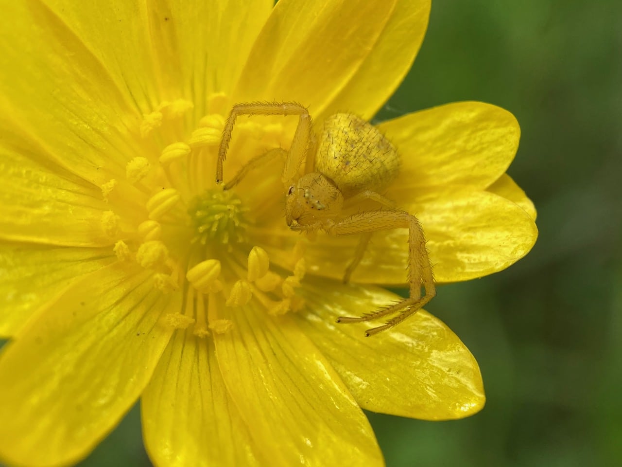 Crab Spiders are usually yellow or white. This ultimately depends on the flower on which they are hunting (active camouflage). They have the ability to change between these colors based on their surroundings, using visual cues. The color-changing process is not instant and can take up to 25 days to complete. Depending on the color of flower they see around them, the spiders can secrete a liquid yellow pigment into the body’s outer cell layer. The baseline color of the spider is white. In its white state, the yellow pigment is sequestered beneath the outer cell layer so that the inner glands which are filled with white guanine are visible. While the spider is residing on a white flower, it tends to excrete the yellow pigment instead of storing it in its glands. In order to change back to yellow, the spider must first produce enough of the yellow pigment. For this reason it takes these spiders much longer to turn from white to yellow than it does the reverse. The color change from white to yellow can take between 10-25 days while the opposite color change takes only about 6 days.