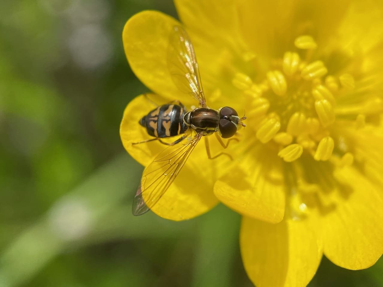 A female Western Calligrapher, Toxomerus occidentalis (Syrphidae) is feeding on pollen of a California Buttercup, Ranunculus californicus.