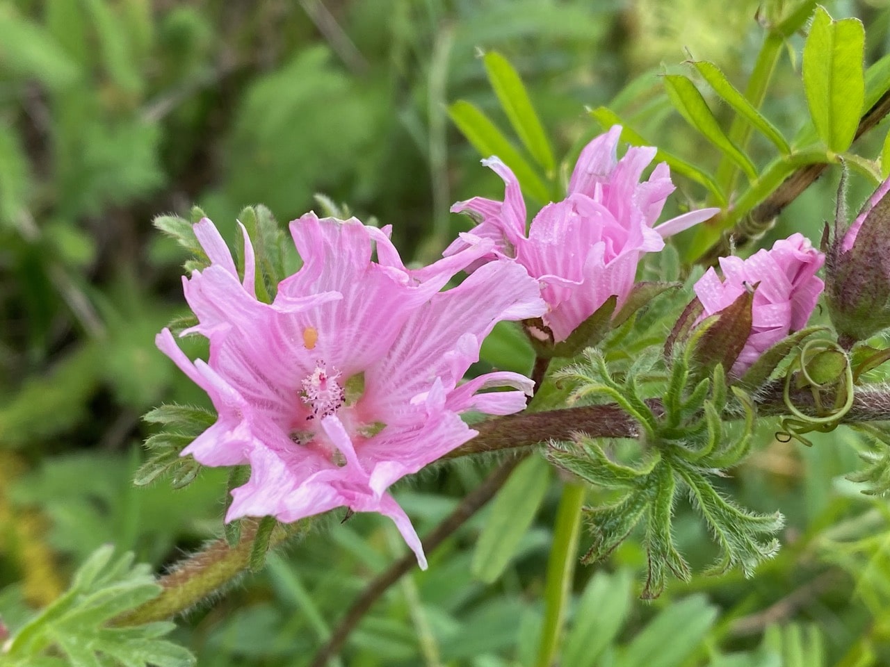 Just ten yards away, I spot this unusual Checkerbloom with frilly petals. I have never seen anything like this, and wonder if it was the same species, Sidalcea malviflora, or just a beautiful variant. Note the flower facing us. It is in the male phase, releasing pollen.