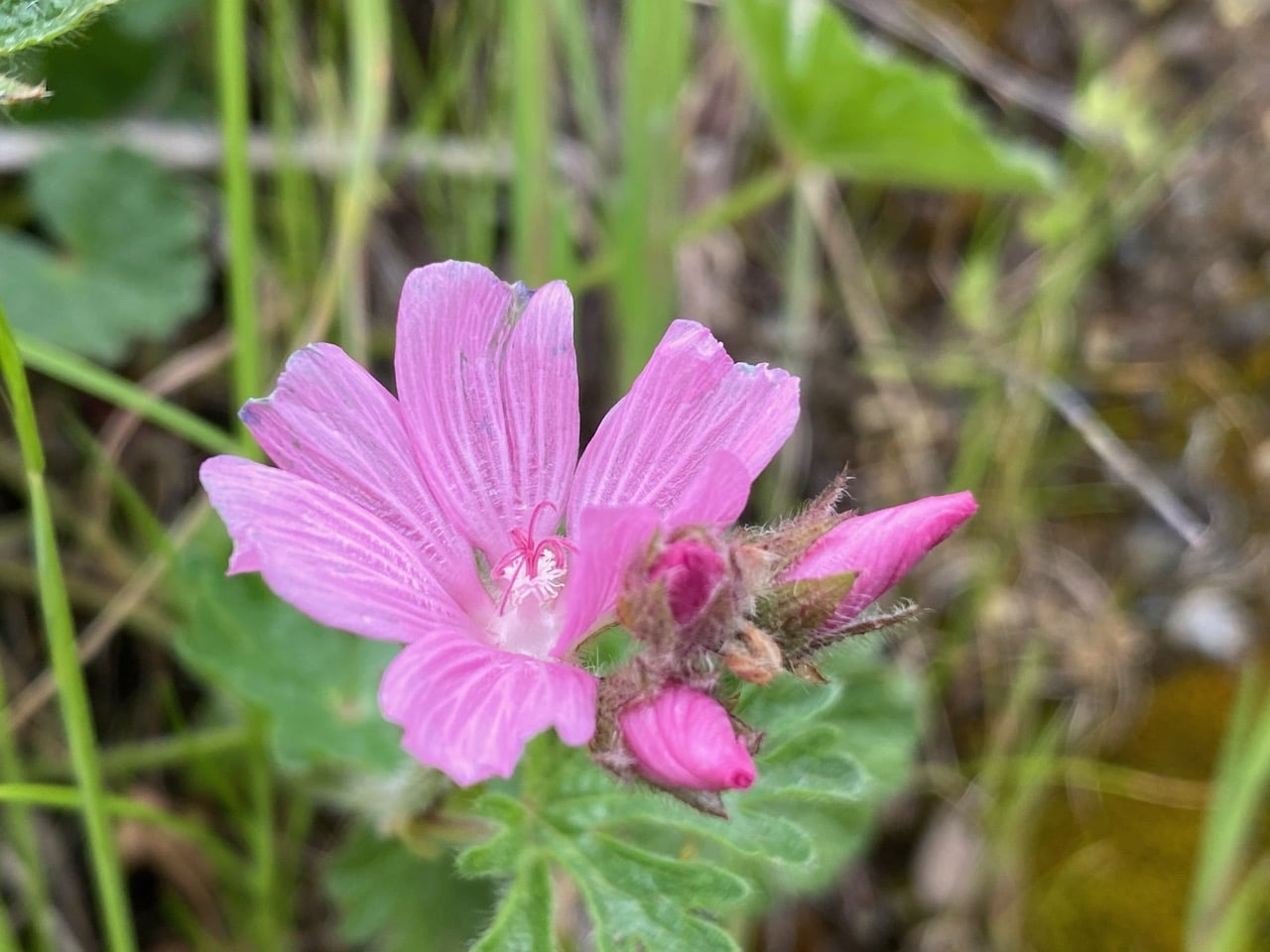 Pink flowers have appeared on the rocky trail bank. They are Checkerbloom, Sidalcea malviflora, one of the larger and eye-catching of our native wildlfowers.