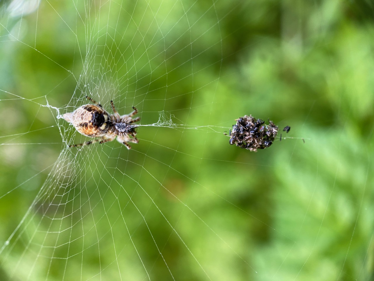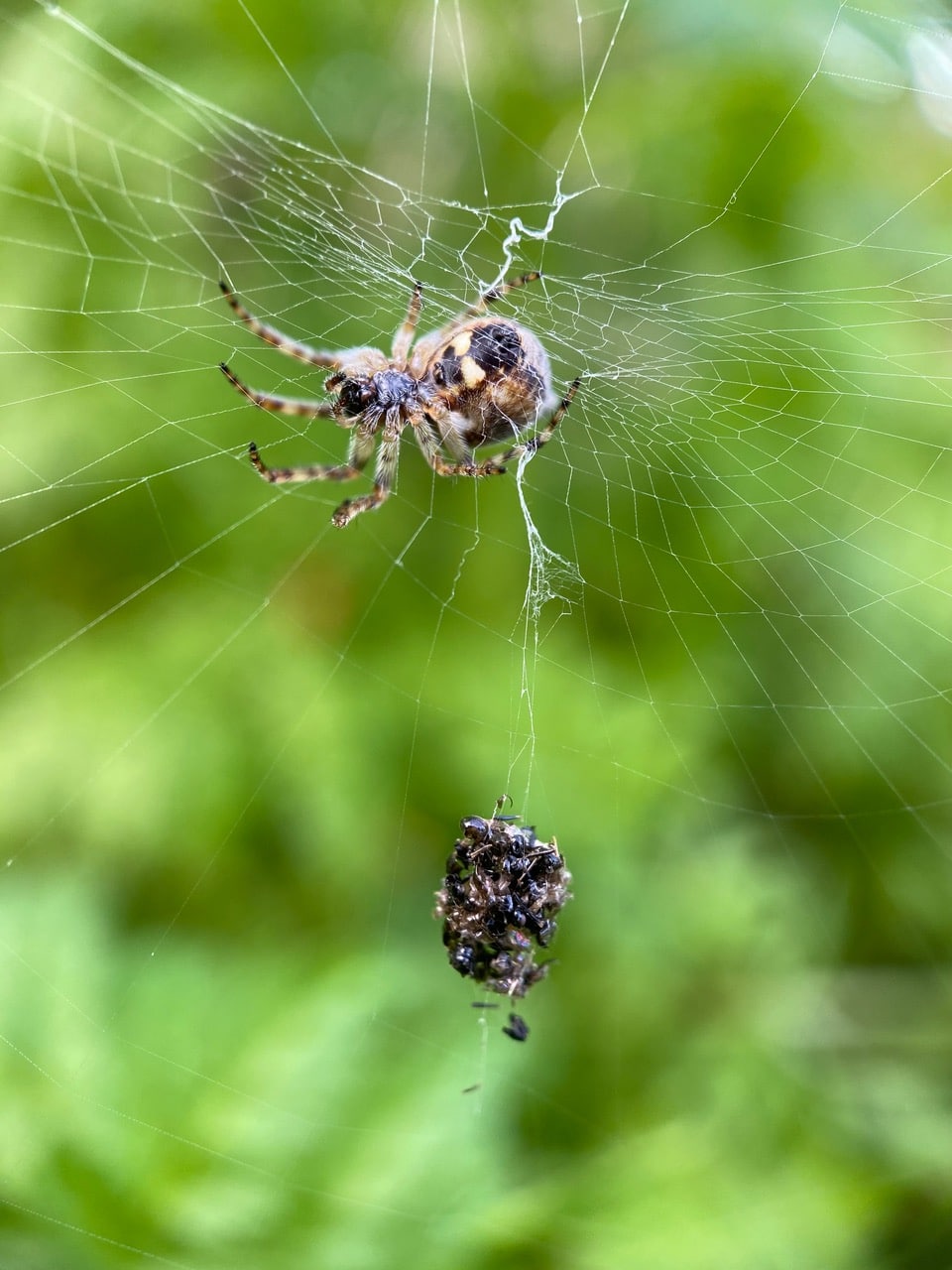 A female Trashline Orbweaver, Cyclosa conica (family Araneidae) is in the hub of her vertical orb web. (We are looking at her underside through the web.) She has hung up a sizable bundle of trash on the web below her, mostly composed of insect parts.