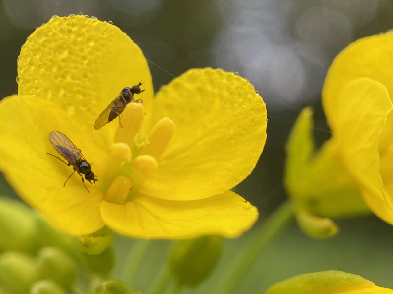 Two Hybotid Dance Flies on a rain-drenched Wild Mustard flower.