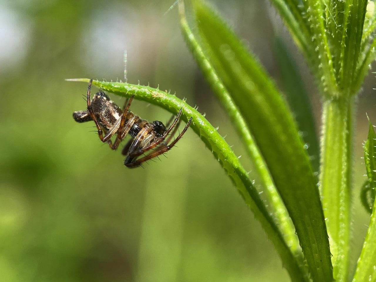 This male is touching down on a leaf of Bedstraw. Note the clumps of white silk behind him. Spiders bunch up silk strands to control their tension as they travel.