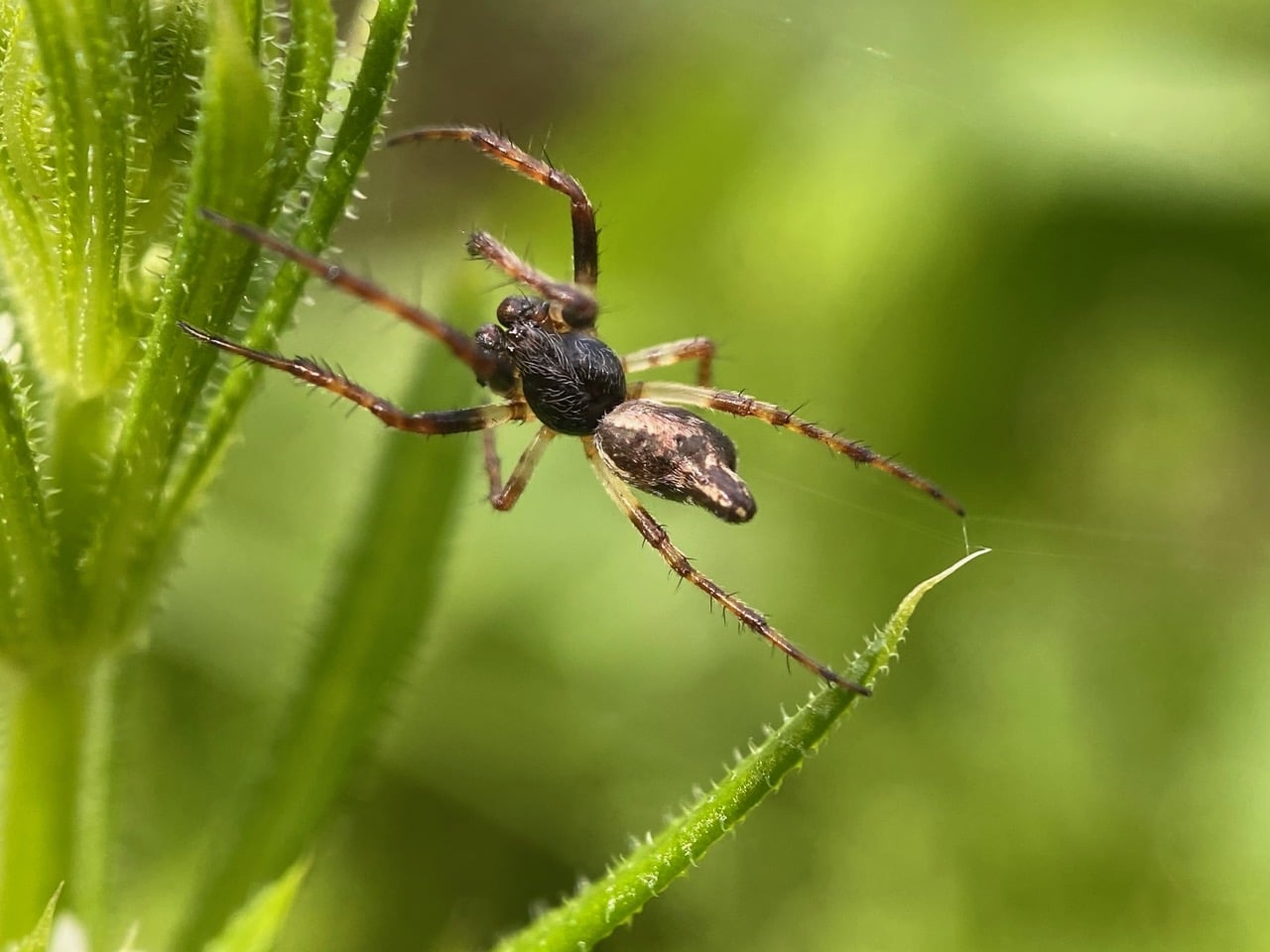 Ooh, here’s yet another male Conical Trashline Orbweaver, making his way across on a fine strand of silk. Note the cluster of black spinnerets at the tip of his abdomen. The spider has his hind legs on the silk, controlling its tension as he travels. So cool!