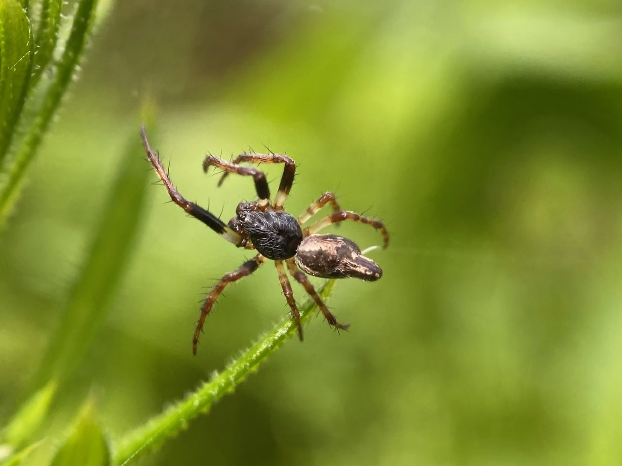 Side view of the spider showing the blunt protrusion on its abdomen, and the dark pedipalps under its face. The pedipalps of spiders serve many functions. They are large, paired mouthparts used variously to manipulate food, as supplementary walking legs, communication devices, sensory structures and sex organs. In sexually mature male spiders, the palms terminate in bulbous tips resembling boxing gloves (a handy rule of thumb for distinguishing males and females). These are used to suck sperm from the genital opening on a male’s belly and inject it into the female’s reproductive tract during mating.
