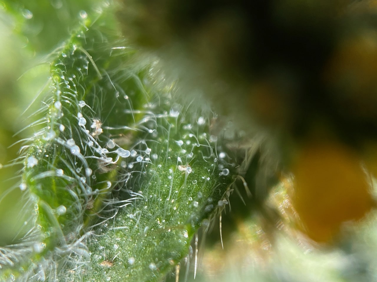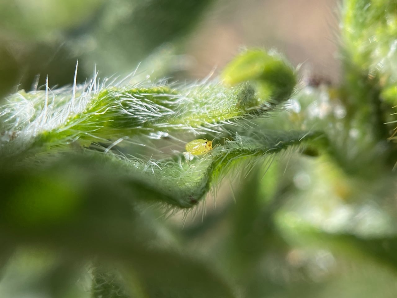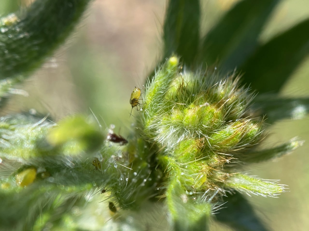 The leaves of Common Amsinckia naturally bristle with stiff white hairs. But mixed in with the hairs now are little milky droplets. That’s not powdery mildew, a fungal infection. Honeydew then? I remember photographing a couple of tiny aphids on this plant a while ago.