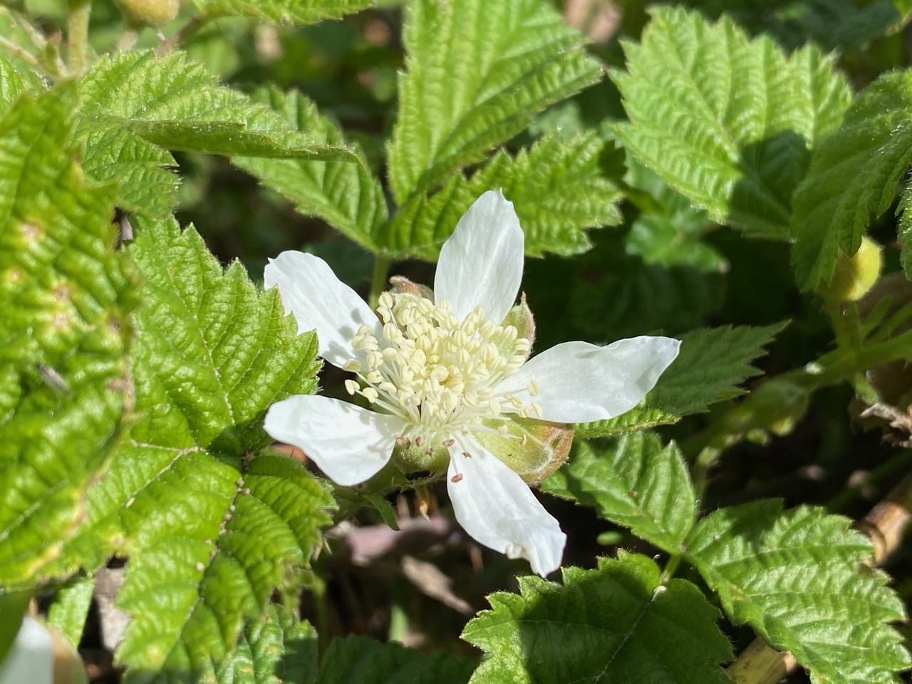 A flower has opened up on a male plant of the California Blackberry, Rubus ursinus. The plant is dioecious, with male and female flowers borne on separate plants. Male flowers have larger petals and a central cluster of numerous stamens. If you have a blackberry plant that never produces fruits, it’s probably a male.