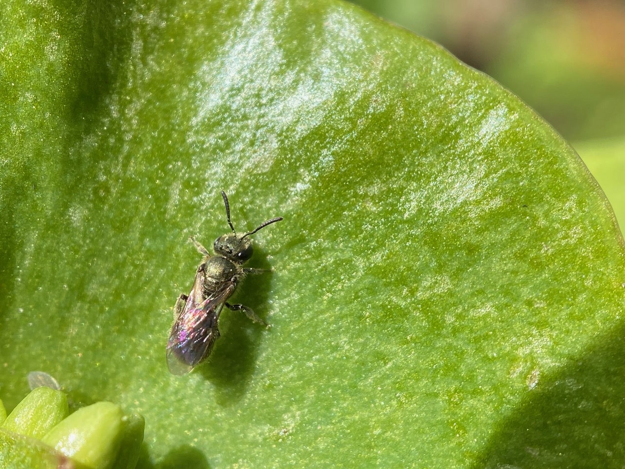 A tiny bee ascends a Miner’s Lettuce leaf after visiting the flowers. It is a Sweat Bee, Lasioglossum sp. (family Halictidae).