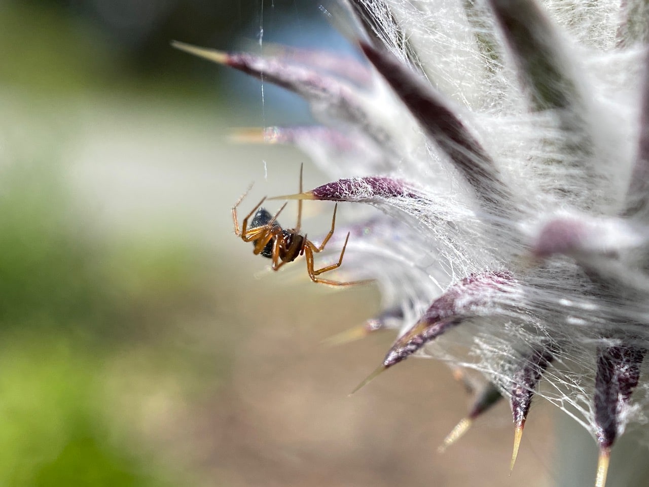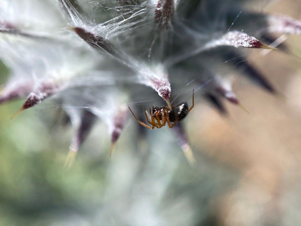A movement on the flowerhead alerts me to the presence of a tiny black spider. It is moving around on the surface, seemingly adding its own silk threads between the sharp spines of the phyllaries.