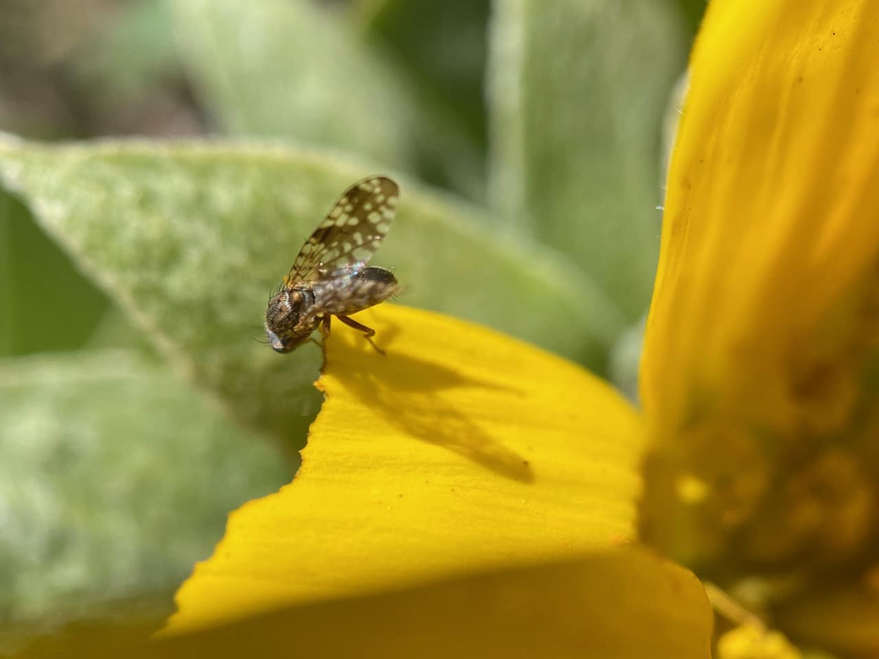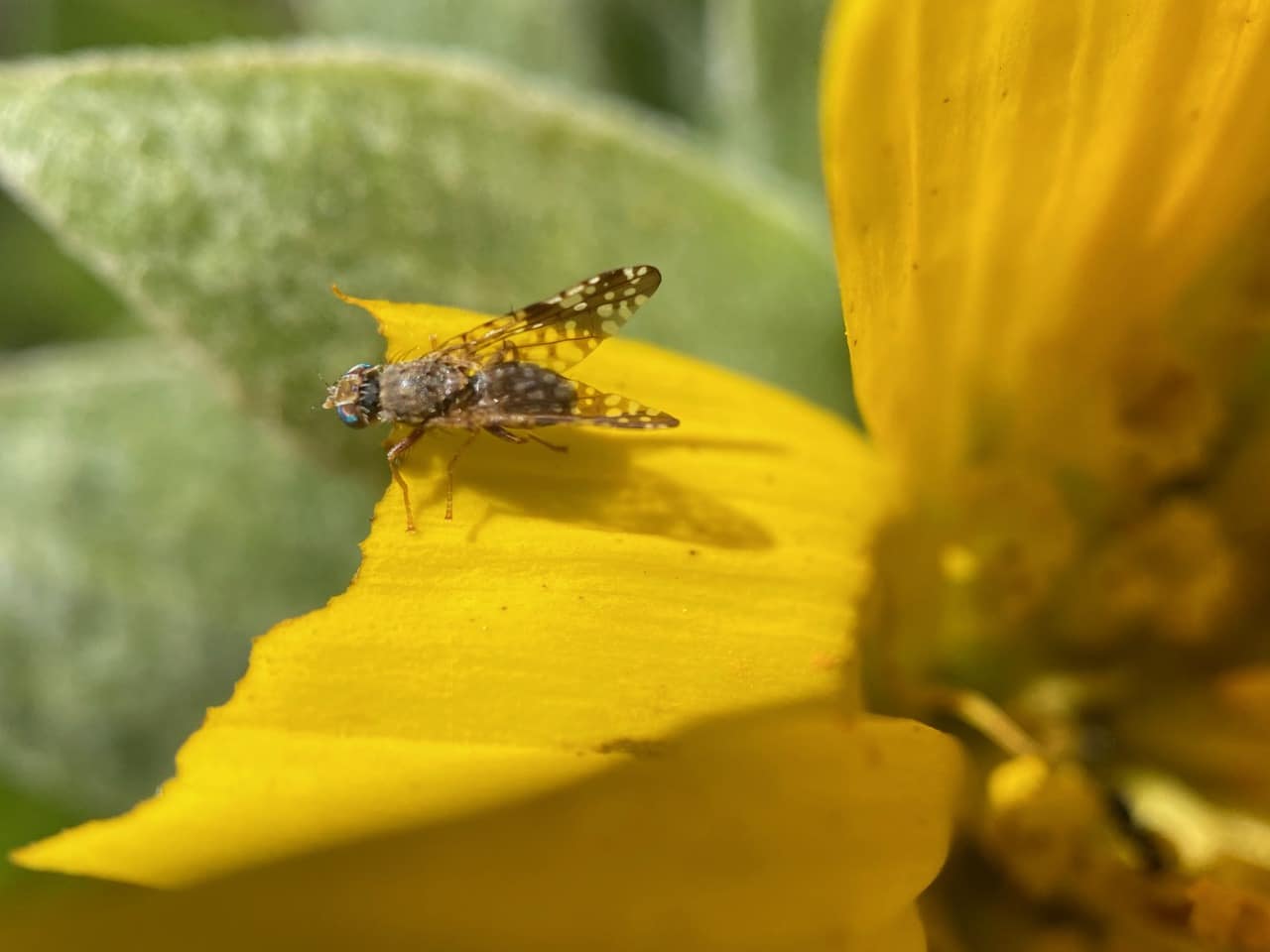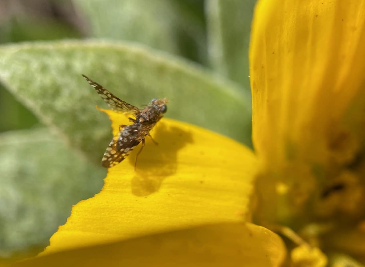 A male Sunflower Seed Maggot Fly, Neotephritis finalis (family Tephritidae) is standing stock still on a ray petal of a Mule’s Ear flowerhead.