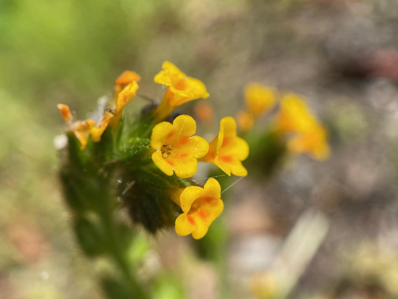 When I look closely at the Fiddleneck flowers, I find that nearly every flower head has been claimed by a spider. There’s a loose network of fine silk threads wrapped around each flower cluster. The traps are set, but where are the insects?